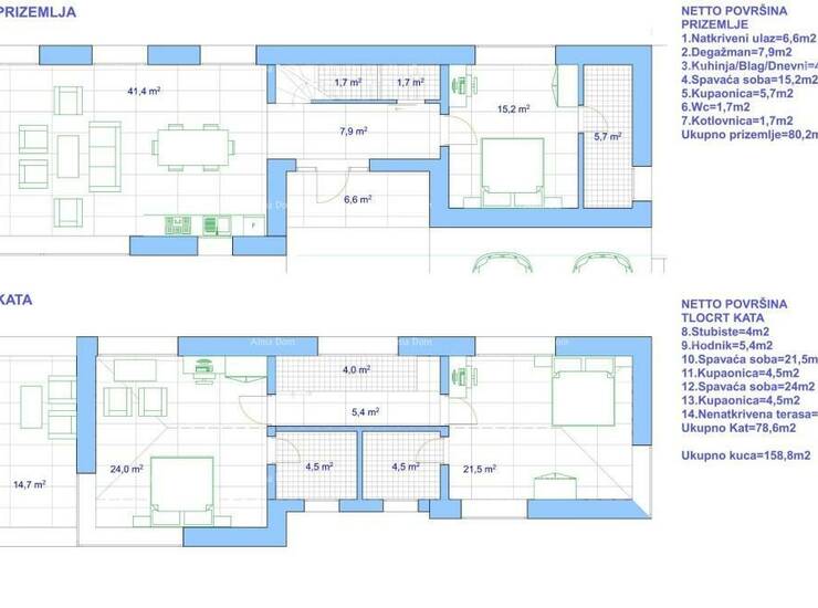 Prizemlje- natkriveni ulaz, degažman, dnevnog boravka s kuhinjom i blagavaonom, spavaće sobe, kupaone, dodatni toalet i kotlovnica.