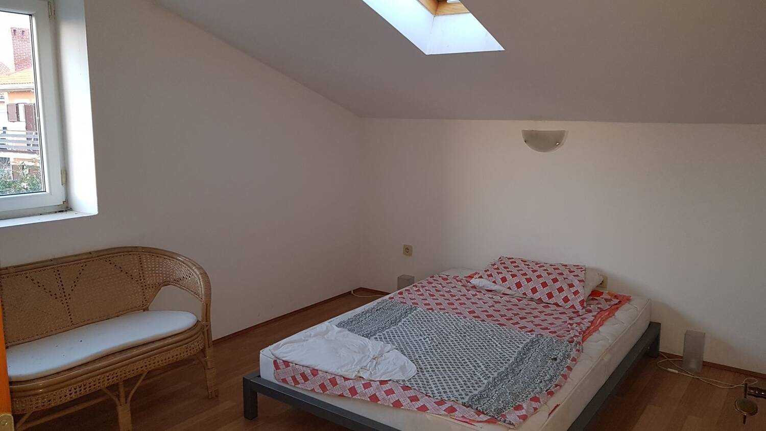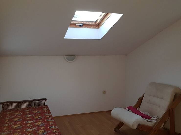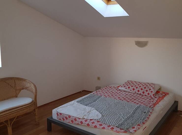 Krovni stan je povezan vanjskim stubištem, sastoji se od dvije spavaće sobe,otvorenog dnevnog boravka uz kuhinju sa blagavaonom s izlazom na balkon, te velikim kupaonom, ukupne površine 80 m2.