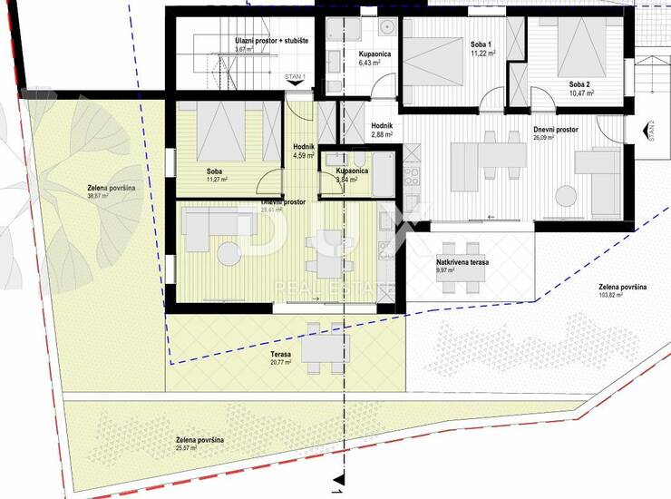 Stan 1 nalazi se u prizemlju, ima stambenu površinu 49,11 m2, a sastoji se od ulaznog hodnika, spavaće sobe, kupaonice i dnevnog prostora s kuhinjom, blagovaonicom i dnevnim boravkom. Iz dnevnog prostora pristupa se vanjskom terasi s lijepim pogledom na zelenilo. Na okućnici stanu pripada 1 parkirno mjesto, a u podrumu i velika ostava od 14,22 m2.
