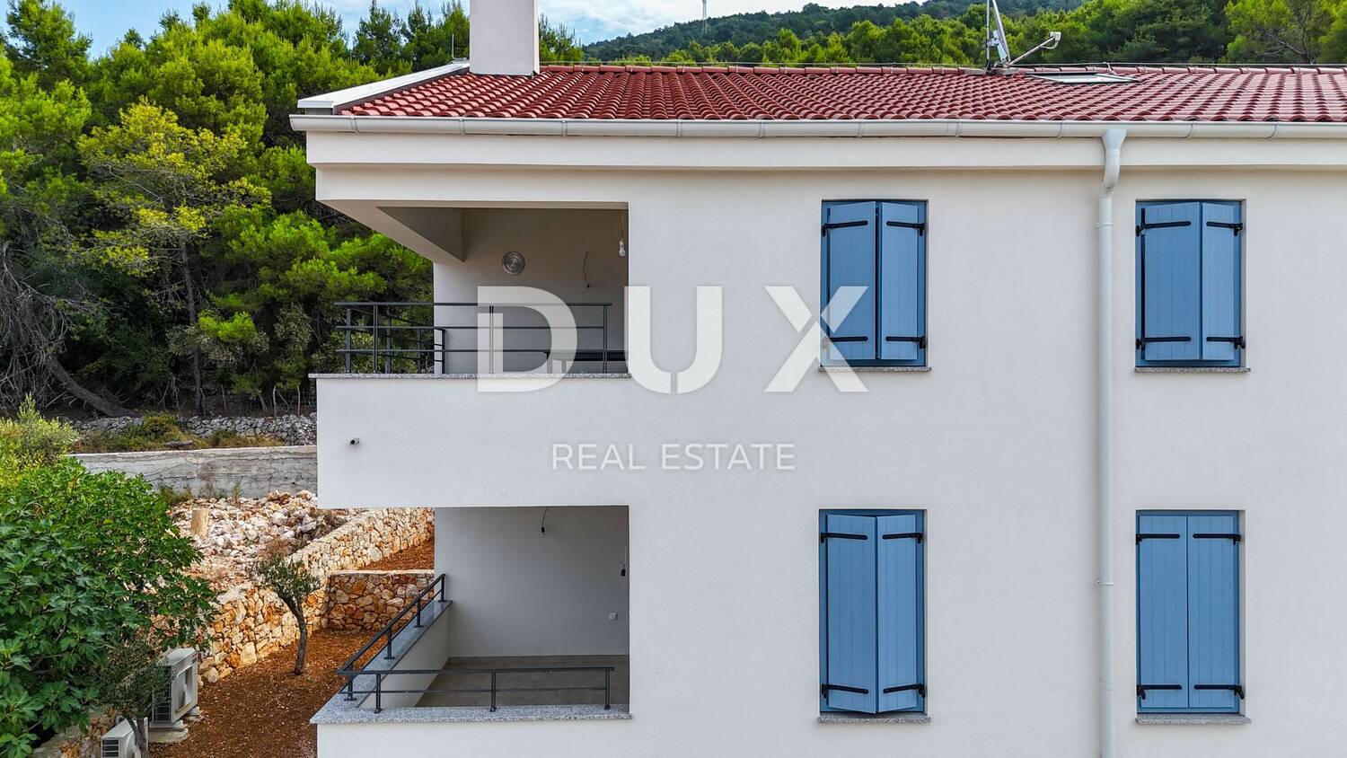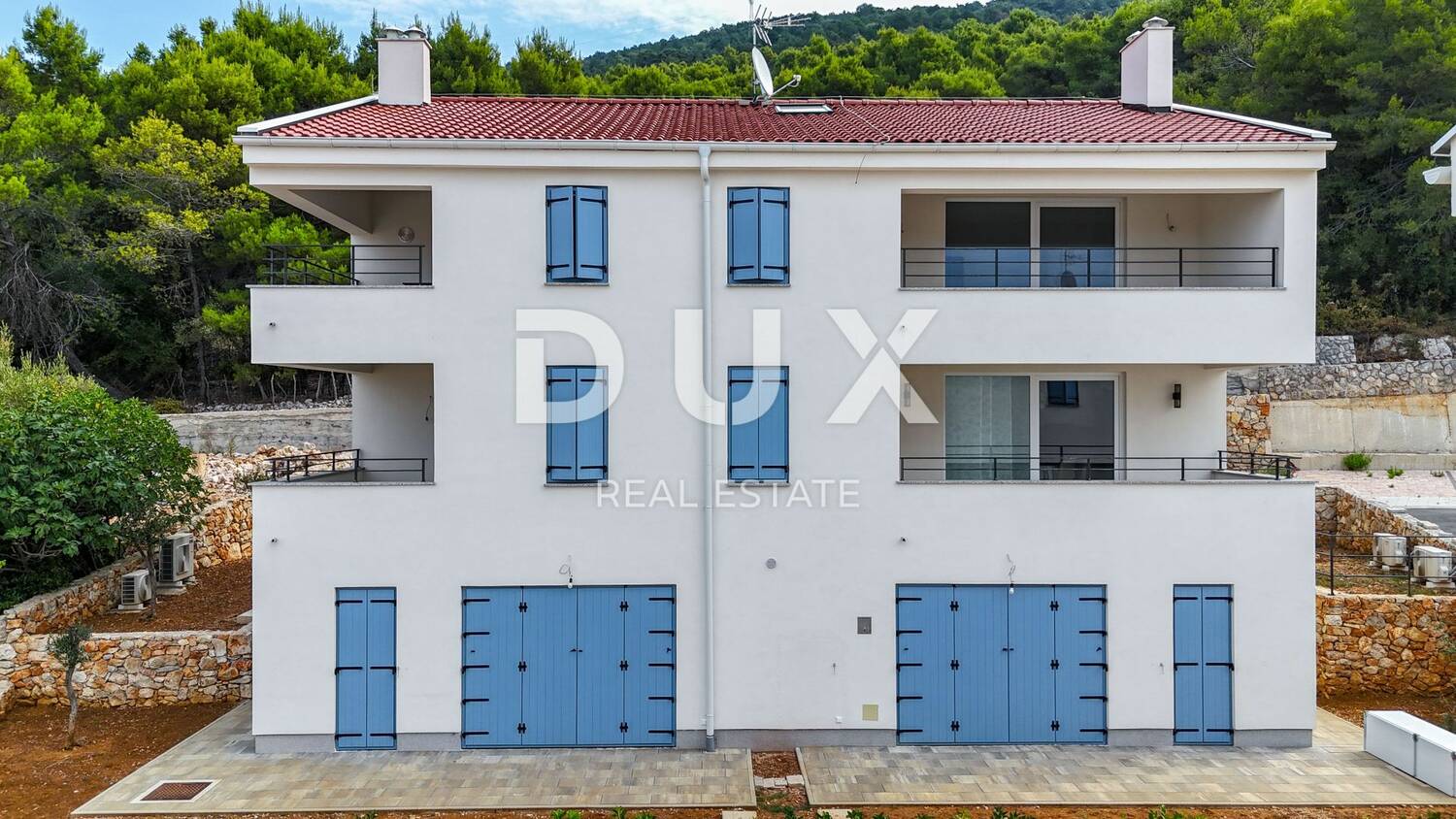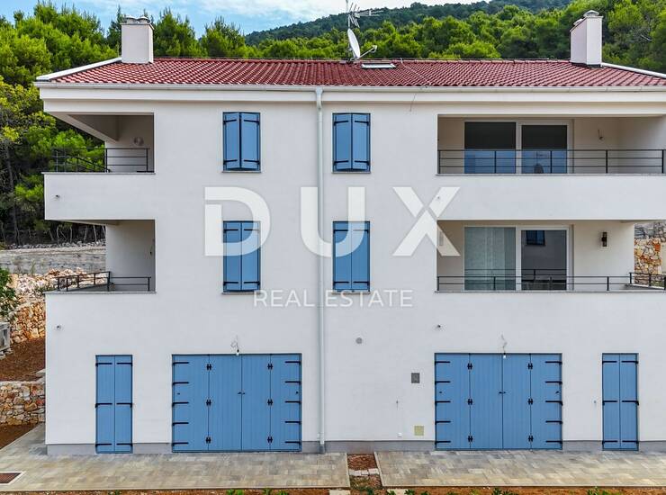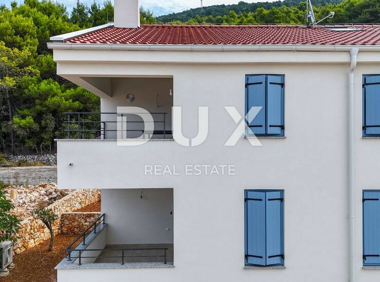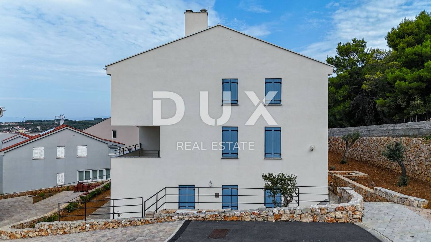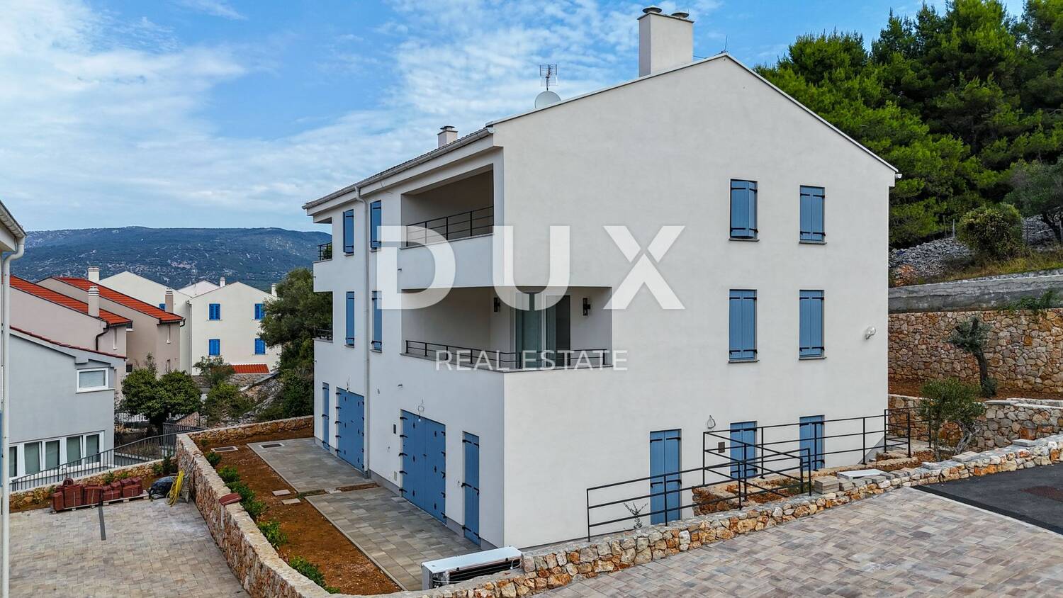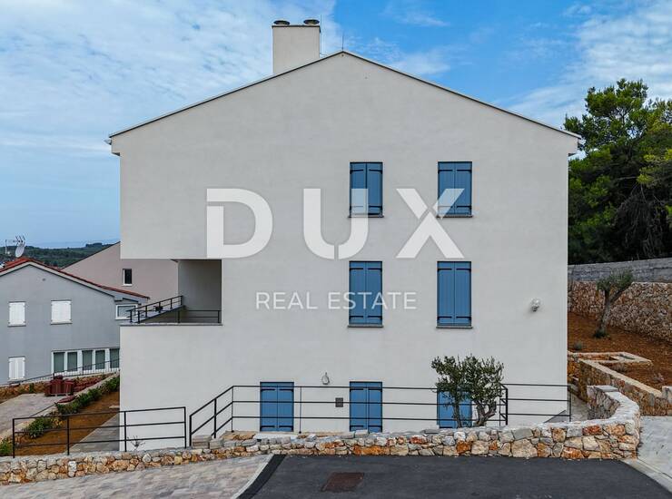 Novogradnja građena vrhunskim materijalima i opremljena modernom opremom. Suvremeni stil, mediteranski šarm, bijela fasada sa plavim prozorima. Nekretnina koja će Vas očarati!