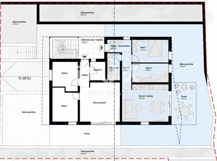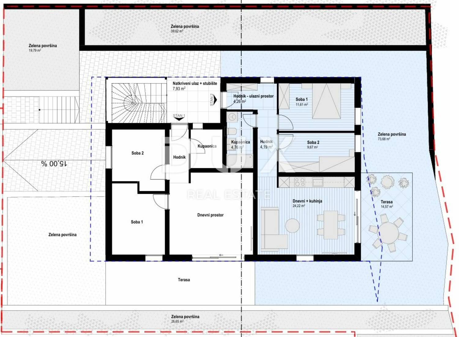 Stan 2 u prizemlju, stambene površine 58,71 m2 sastoji se od ulaznog dijela, hodnika, dvije spavaće sobe, kupaonice te dnevnog prostora s kuhinjom, blagovaonicom i mjestom za opuštanje. Iz dnevnog prostora pristupa se vanjskom dijelu, gdje se nalazi popločana terasa i lijepi zeleni vrt 74 m2. U garaži ovom stanu pripadaju 2 parkirna mjesta i spremište 10,67 m2.