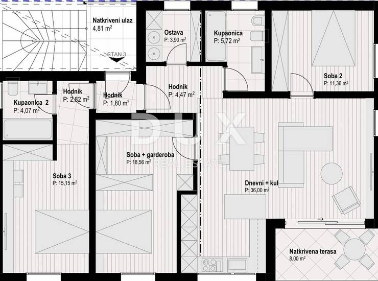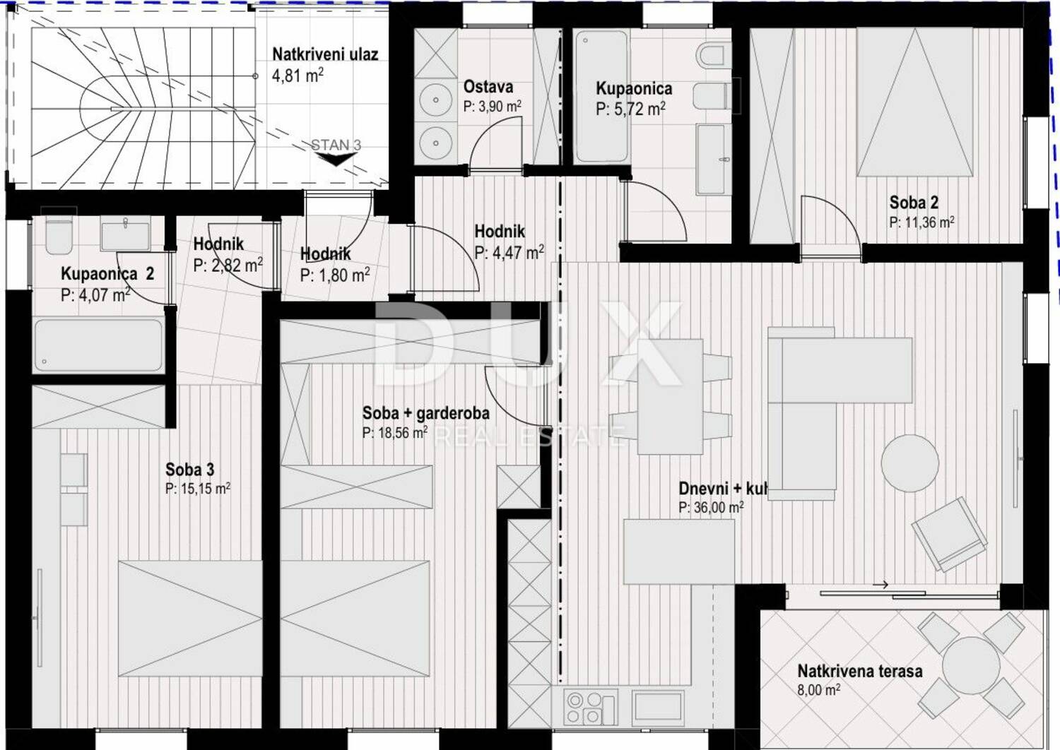 Stan 3 nalazi se na katu, ima stambenu površinu 109,85 m2, a sastoji se od ulaznog dijela, hodnika, spavaće sobe s vlastitom kupaonicom, spavaće sobe s velikom garderobom te još jedne spavaće sobe od 11,36 m2, dodatne kupaonice, ostave te prostranog dnevnog prostora s kuhinjom, blagovaonicom i mjestom za opuštanje. Iz dnevnog prostora pristupa se vanjskom dijelu - natkrivenoj terasi s neprocijenjivim pogledom na uvalu. U garaži ovom stanu pripadaju 2 parkirna mjesta i spremište 10,67 m2.