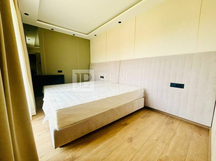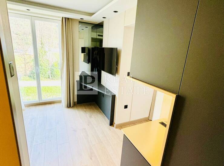 Modernost i elegancija interijera vidljivi su u detaljima poput: kupaonice s namještajem od Kerok materijala stopostotno otpornog na vodu i udarce, keramike velikog formata, mat bijelih sanitarija s zlatnim detaljima i protuprovalnih ulaznih vrata, a zaista poseban i ugodan ambijent pružaju spušteni stropovi s integriranom LED i indirektnom rasvjetom.