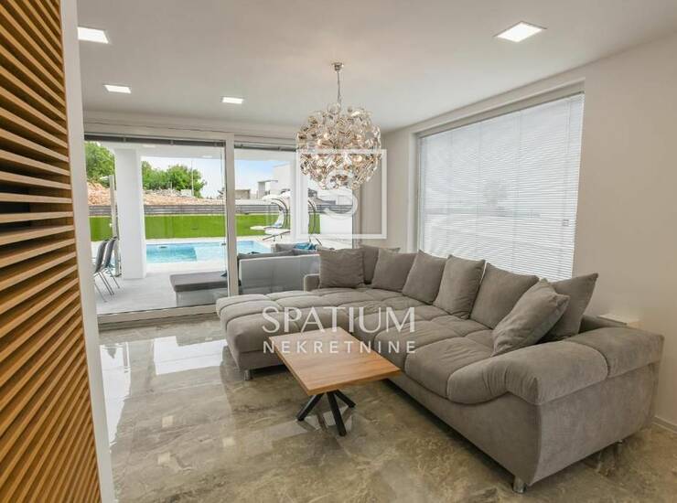 Prizemlje sadrži veliki dnevni boravak s prostranom kuhinjom i blagovaonicom te okućnicu s bazenom koji je prilagođen za djecu i odrasle. Na katu su četiri spavaće sobe od kojih svaka ima svoju kupaonicu. Tu je također i spa prostor sa saunom, ležaljkama, tušem i pripremom za jacuzzi. Veliki dio parcele je neiskorišten, a može se napraviti minigolf ili vanjski prostor za odmor. Udaljenost od mora i plaža je svega 300 m. Radi svoje mikrolokacije ova nekretnina je idealna prilika za bavljenje turističkom djelatnošću kao i za dugoročan, miran obiteljski život.