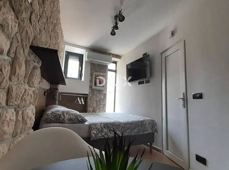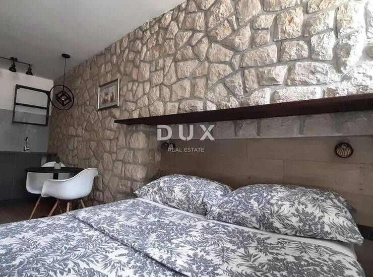 Prizemni apartman i unutarnje stubište ističu se zidovima obloženim prirodnim kamenom, koji prostoru daju poseban, autentičan primorski šarm.