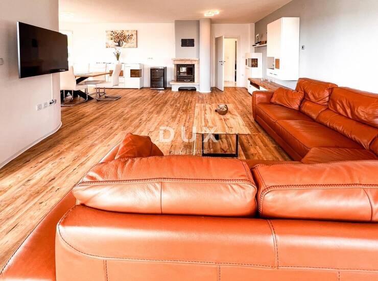 Na katu su smještene tri luksuzne spavaće sobe, uključujući master sobu s vlastitom garderobom i kupaonicom, a sve sobe izlaze na terasu s koje se pruža panoramski pogled na more i gradsku rivu. U predivno uređenoj okućnici nalazi se bazen sa sunčalištem, roštilj, jacuzzi, prostrani vanjski prostori za druženje te dvije garaže (25 i 35m2!) te više od sedam parkirnih mjesta.