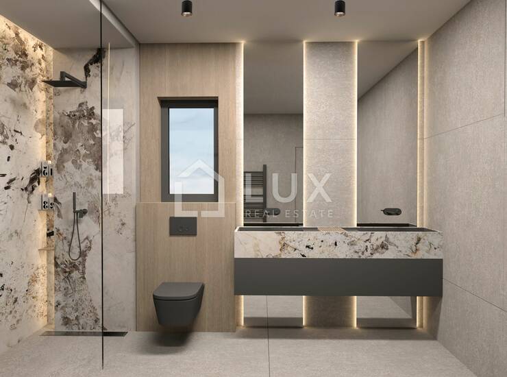Kuća se proteže kroz dvije etaže, u prizemlju se nalazi ulazni hodnik, prostrano spremište, WC, jedna spavaća soba sa vlastitom kupaonicom te wellness dio koji se sastoji od teretane, jacuzzija i saune odakle se direktno može izaći na terasu, bazen, sunčalište i ograđeni dio okućnice. Unutarnjim stepenicama penjemo se na kat gdje su smještene dodatne dvije spavaće sobe svaka sa vlastitom kupaonicom te open space koncept dnevog boravka sa kuhinjom i blagovaonicom te izlaza na natkrivenu terasu odakle se pruža panoramski pogled na more i otok Krk.