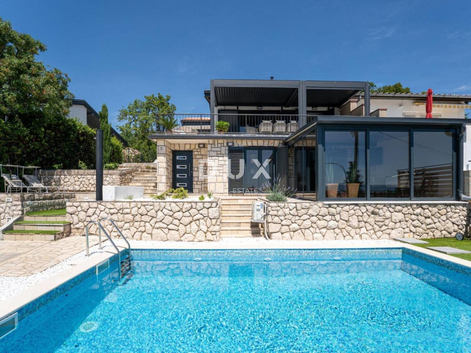 Vanjski dio nekretnine stvoren je za uživanje – prostrani bazen sa sunčalištem, mediteranski ambijent i uređena okućnica pružaju osjećaj privatne oaze nadomak mora.