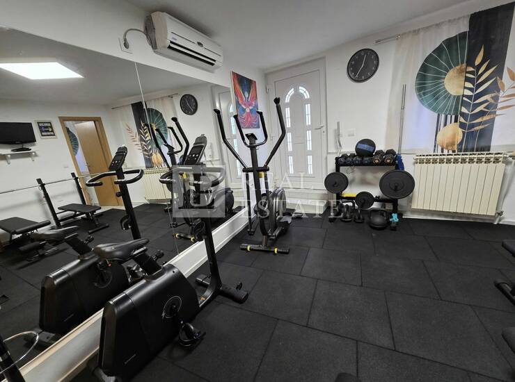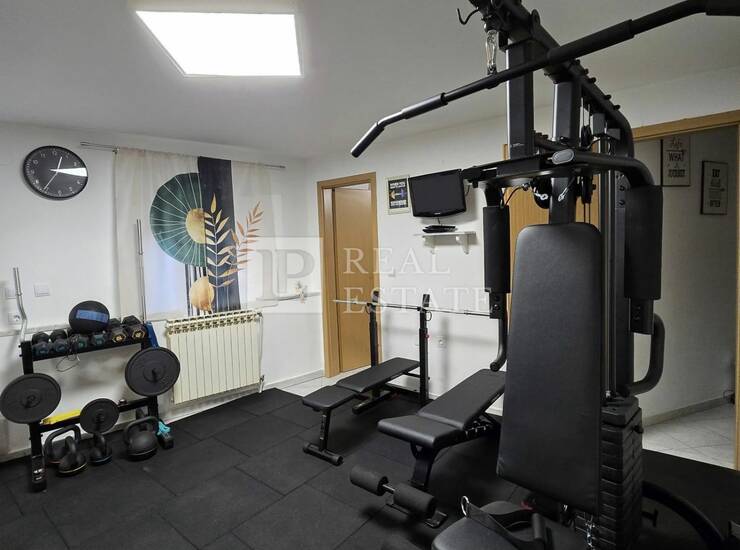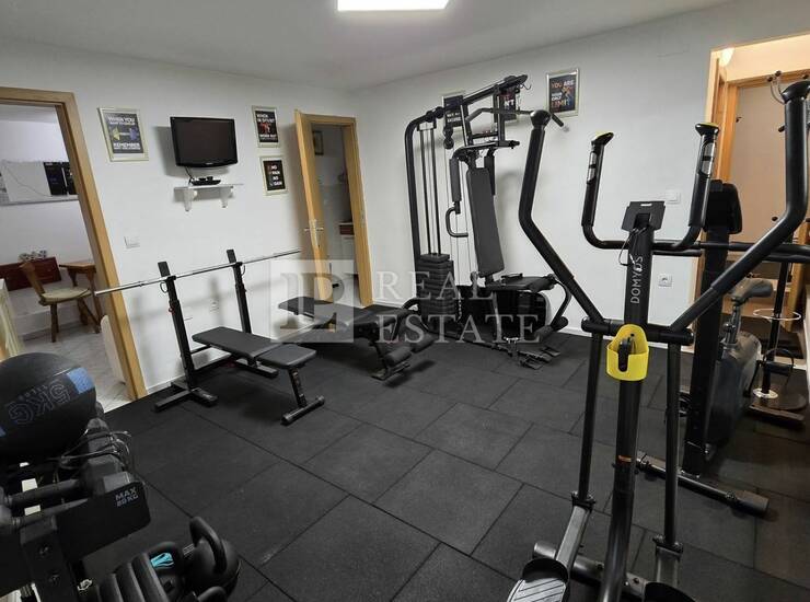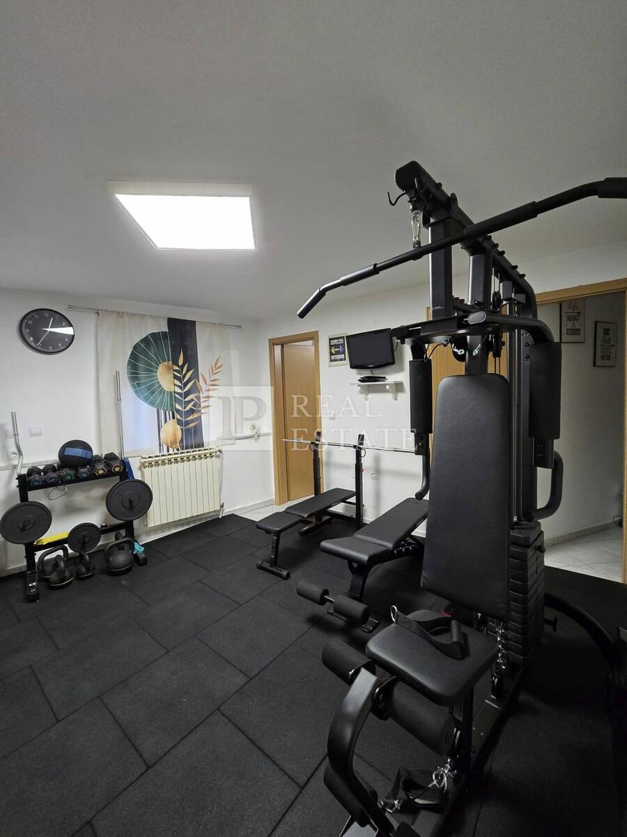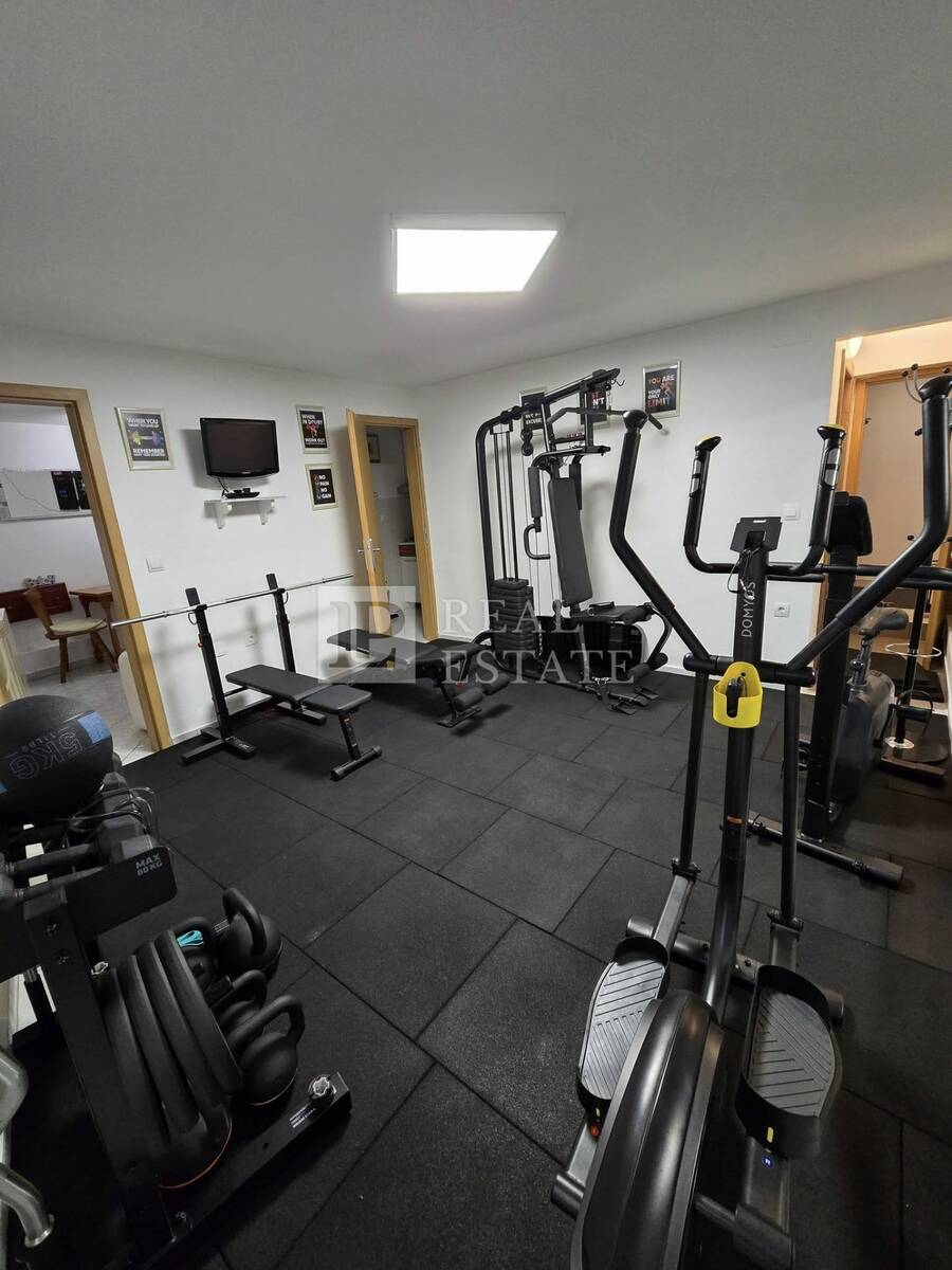 Prizemlje kuće pretvoreno je u privatnu zonu užitka i rekreacije – prostor gdje se trening i zabava stapaju u jedan stil života, s potpuno opremljenom teretanom, elegantnom biljar-sobom, malom kuhinjom, kupaonicom i kotlovnicom.