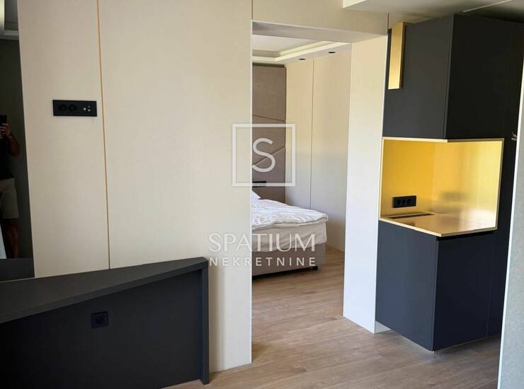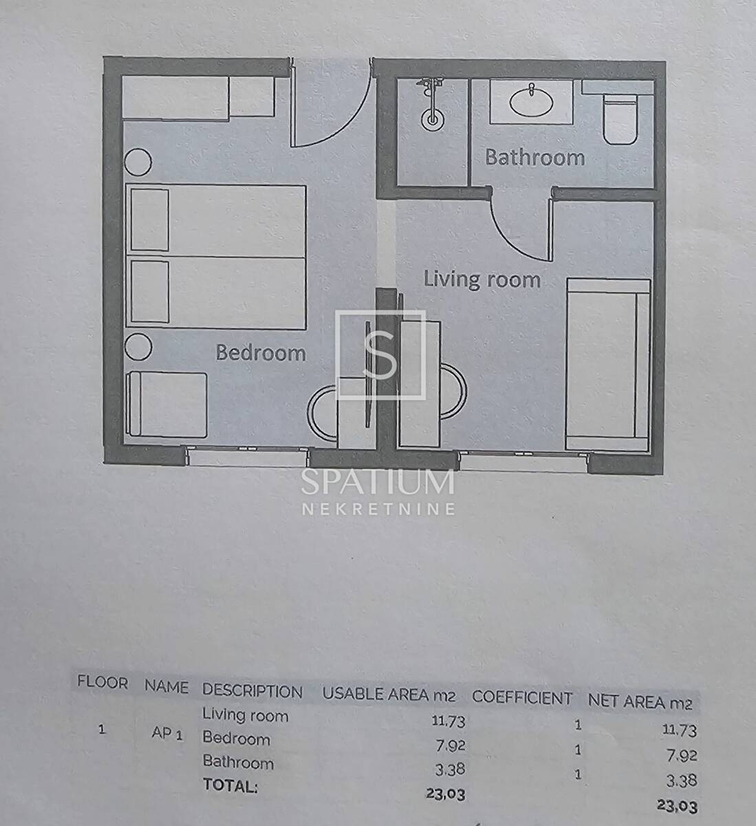 Odlično iskorišten prostor površine 23,03m2, sastoji se od dnevnog boravka, sobe i kupaone. Postoji mogućnost kupnje parkirnog mjesta.