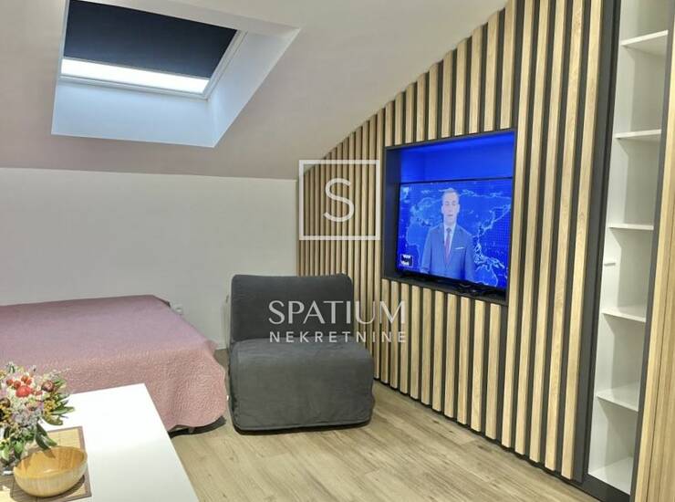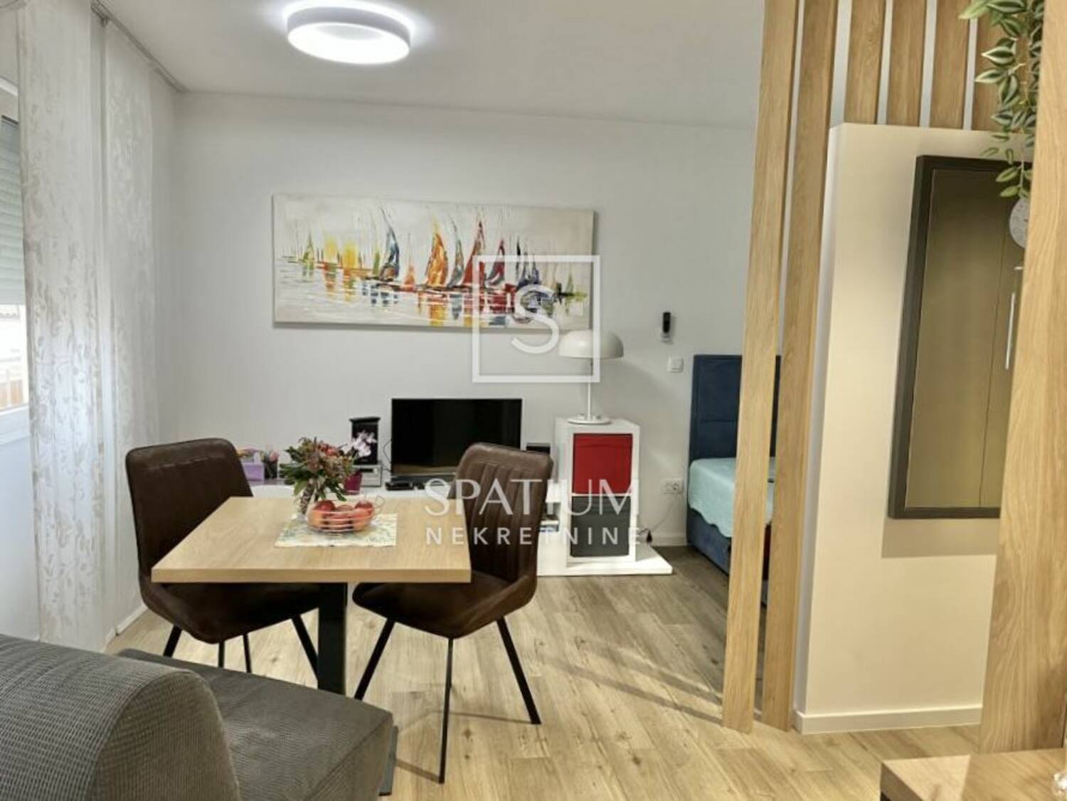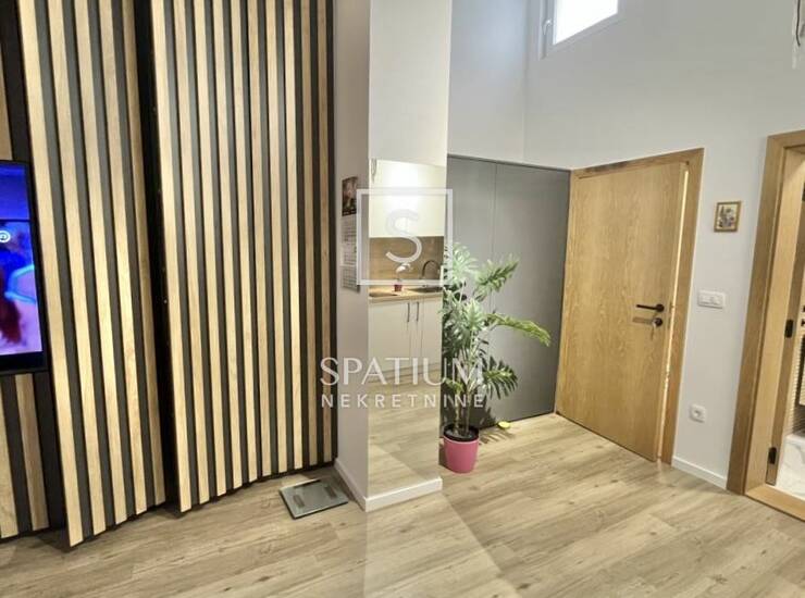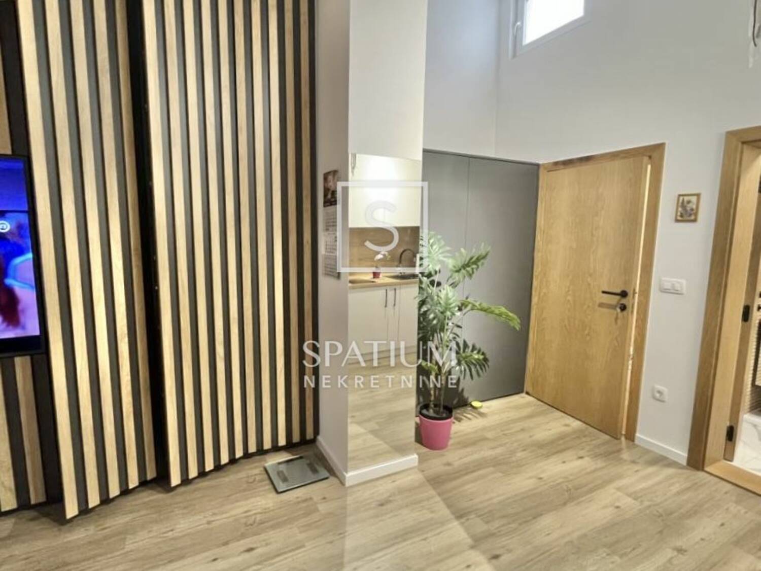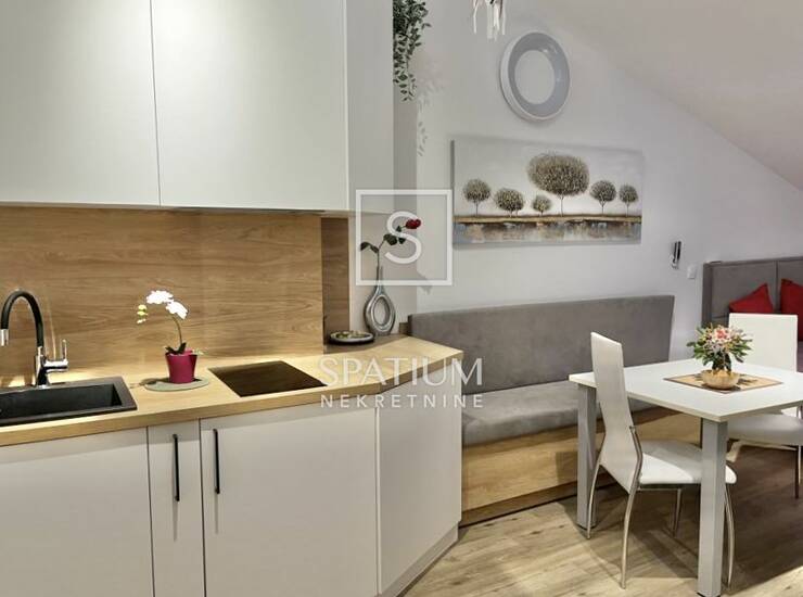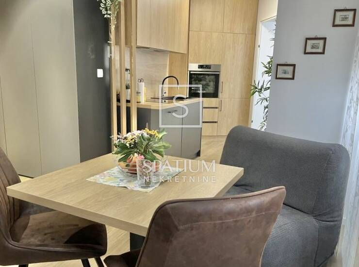 Prostor je dizajnerski uređen s naglaskom na funkcionalnost i estetiku, a po mjeri izrađeni ormari maksimalno iskorištavaju prostor uz moderan i elegantan izgled. Apartman se prodaje u potpunosti namješten.