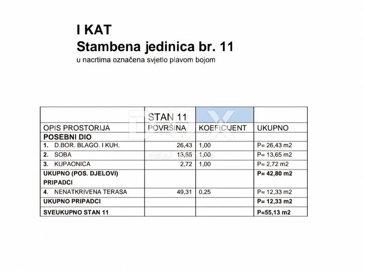 Stan se sastoji od jedne spavaće sobe, kuhinje s blagovaonicom, dnevnog boravka i nenatkrivene terase od 49,31 m2.