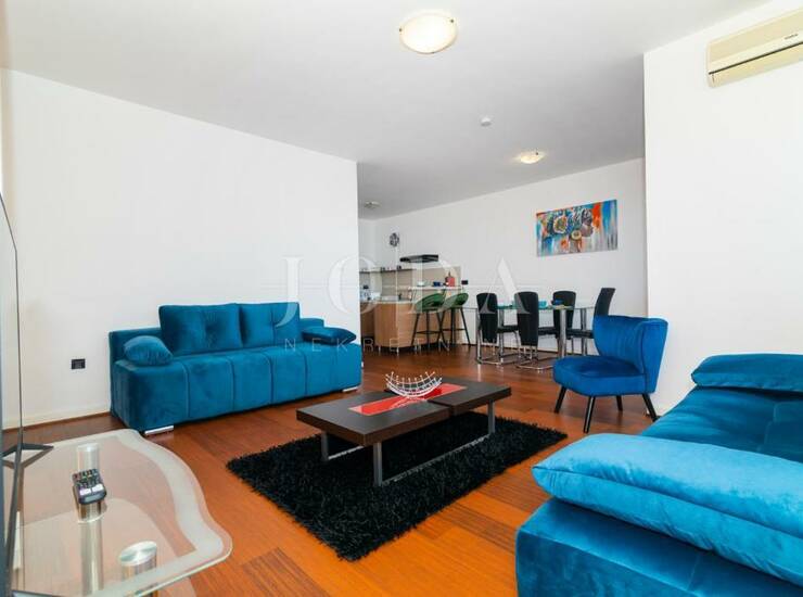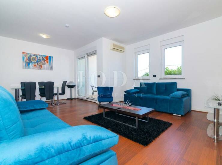 Apartman ima ukupnu stambenu površinu od 72 m², a sastoji se od prostranog dnevnog boravka s kuhinjom i blagovaonicom, dvije spavaće sobe te kupaonice. Iz dnevnog boravka izlazi se na balkon s pogledom na more, idealan za opuštanje i uživanje u mediteranskom okruženju.