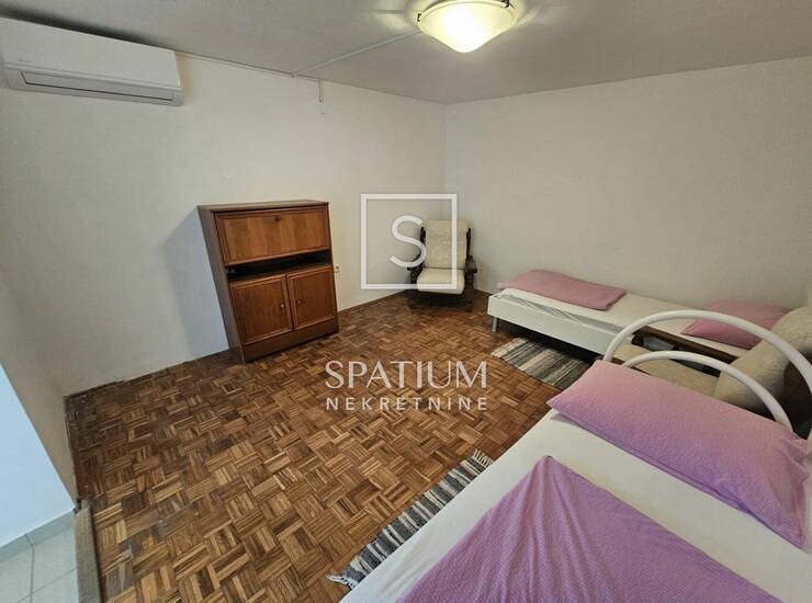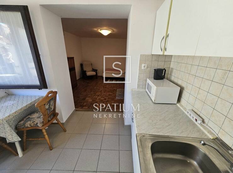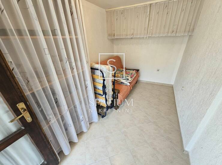 Ovaj stan se nalazi u suterenu privatne kuće sa ukupno tri etažirana stana. Kuća je izgrađena 1968. godine te potpuno adaptirana i dograđena 2000. godine, a ispred kuće se nalazi parking. U stan se ulazi preko zajedničke lođe/hola i spušta stepeništem do velike pripadajuće terase od 28,75 m2.Terasa je zaklonjena od pogleda, okružena susjednim kućama i vrtom, a kameni kamin i vanjska garniture pružaju opuštajući ambijent za odmor i druženje. Iz terase se ulazi u stan, koji se sastoji od kuhinje sa manjom blagovaonicom i dnevnim boravkom površine 23,60 m2, spavaće sobe površine 7,80 m2 i dvije kupaonice. Grijanje je osigurano putem klima uređaja, a režije su niske. Prednosti ovog stana su: blizina moru, zaklonjen položaj koji osigurava potpunu privatnost te prostrana terasa koja omogućuje cjelodnevno uživanje na otvorenom.