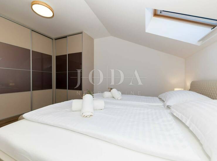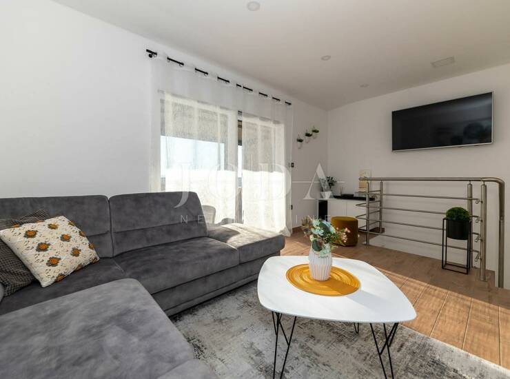 – 2. etaža: dnevni boravak, master spavaća soba (krevet 200×200) s vlastitom kupaonicom, terasa.