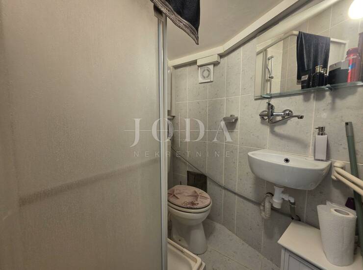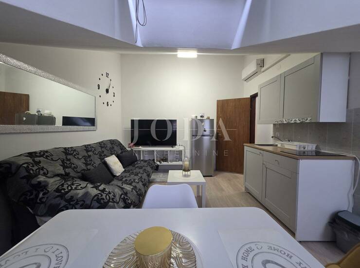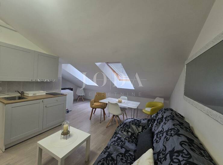Prodajemo jednosoban stan u potkrovlju stambene zgrade. Stan se sastoji od jedne sobe, dnevnog boravka, kuhinje, kupaone i hodnika ukupne površine 42,91 m2, hodnika ukupne površine 42,91 m2 , s pripadajućim zajedničkim uazom od 2,38m2. Nekretnina je u potpunosti namještena i klimatizirana i kao takva se i prodaje.