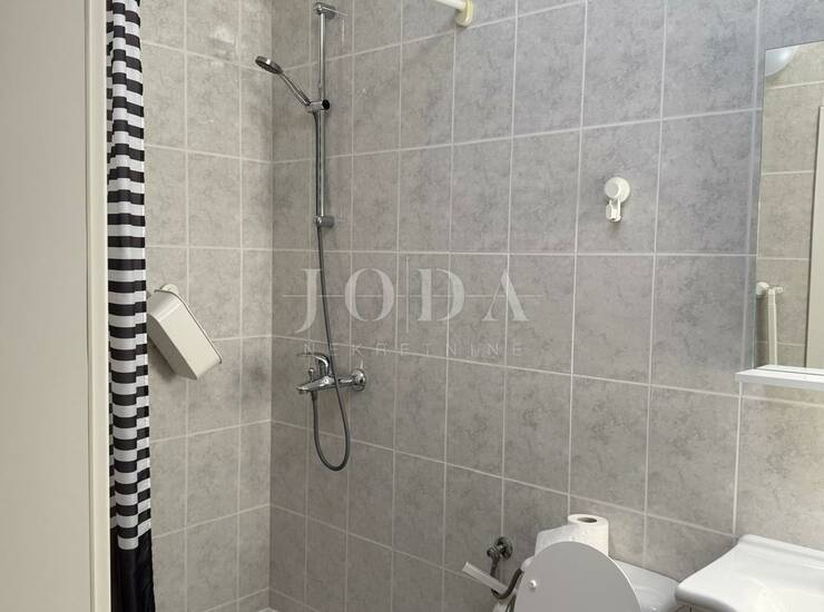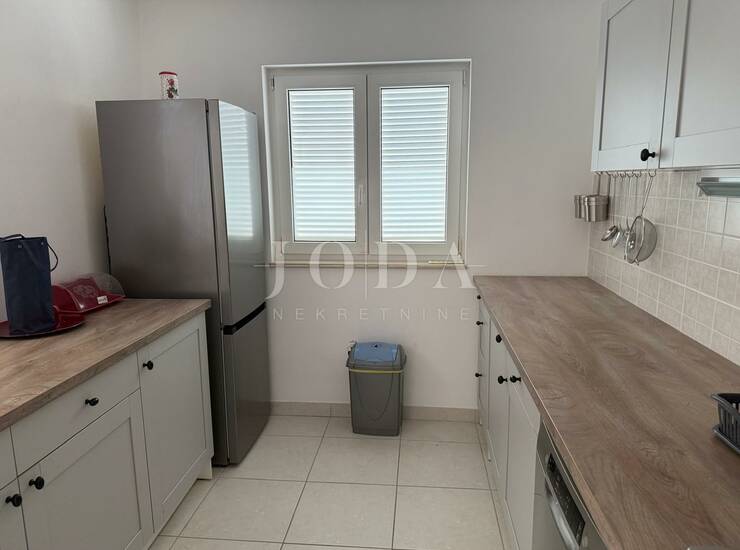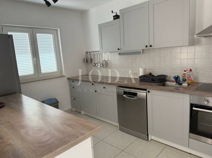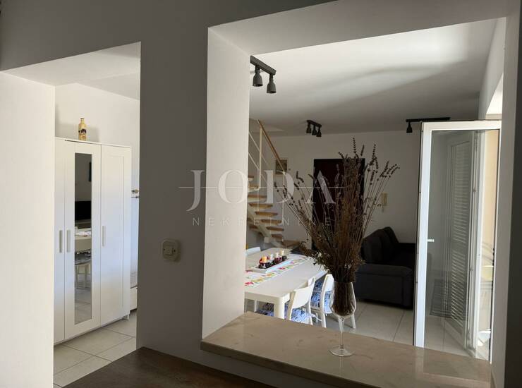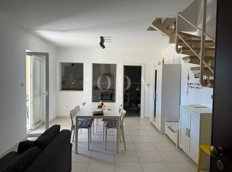 Stan u novijoj zgradi na 2. katu, dvoetažni stan. Sastoji se od kuhinje, blagovaone i dnevnog boravka, balkona i kupatila i wc-a. Unutrašnje stepenice vode na kat, gdje su dvije spavaće sobe i kupatilo i wc. Stan se prodaje kompletno namješten. Blizina centra i mora 300 m.