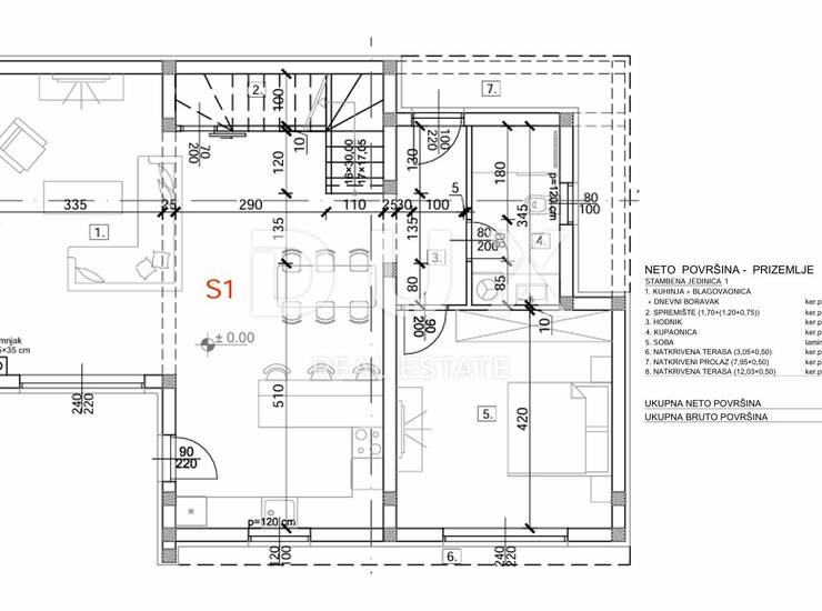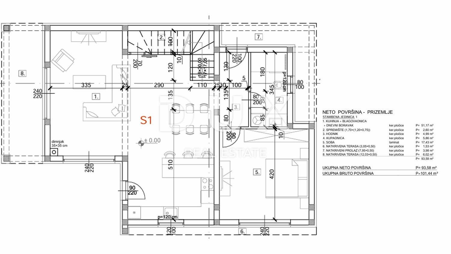 Sadržaj prizemlja: hodnik, kupaonica, spremište, spavaća soba, kuhinja s blagovaonicom i dnevnim boravkom, izlaz na natkrivenu terasu
