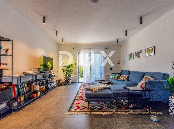 Okućnica površine 400 m² pažljivo je dizajnirana s mediteranskim biljem koje stvara opuštajući ambijent. Na raspolaganju su tri natkrivena parkirna mjesta s punionicom za električne automobile. Kuća je opremljena suvremenim tehnologijama: bazen se grije dizalicom topline, voda se zagrijava putem solarnih panela, a grijanje i hlađenje cijele kuće osiguravaju vrhunski Daikin klima uređaji. U kupaonicama je podno grijanje.