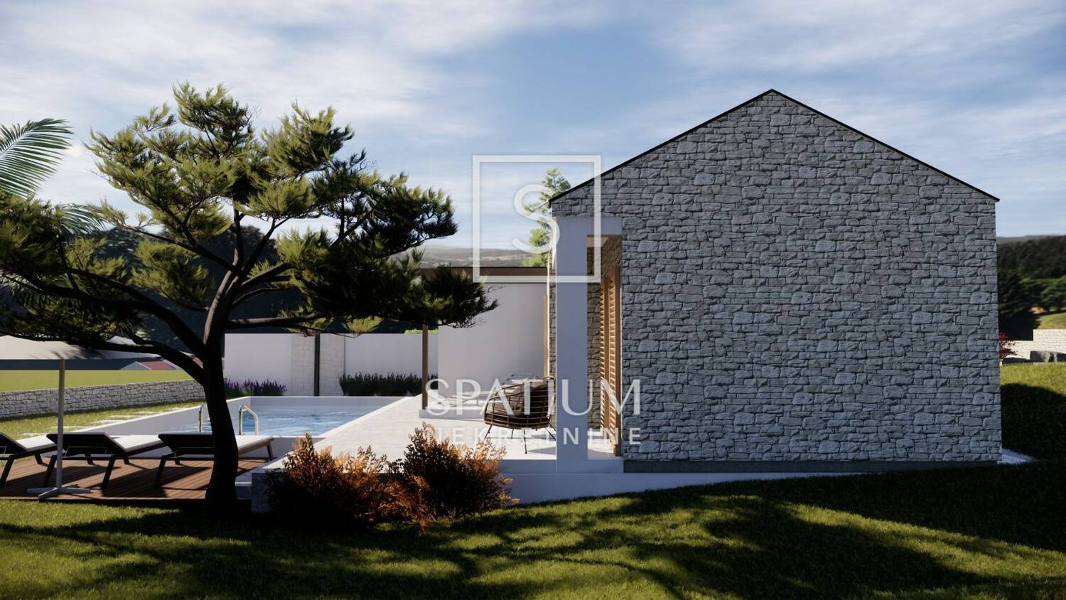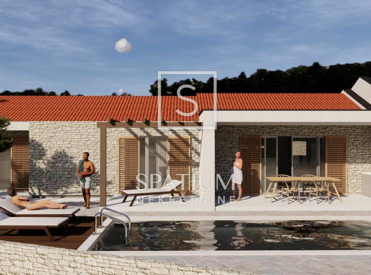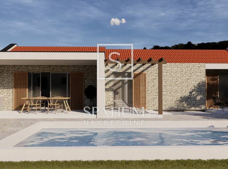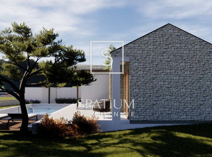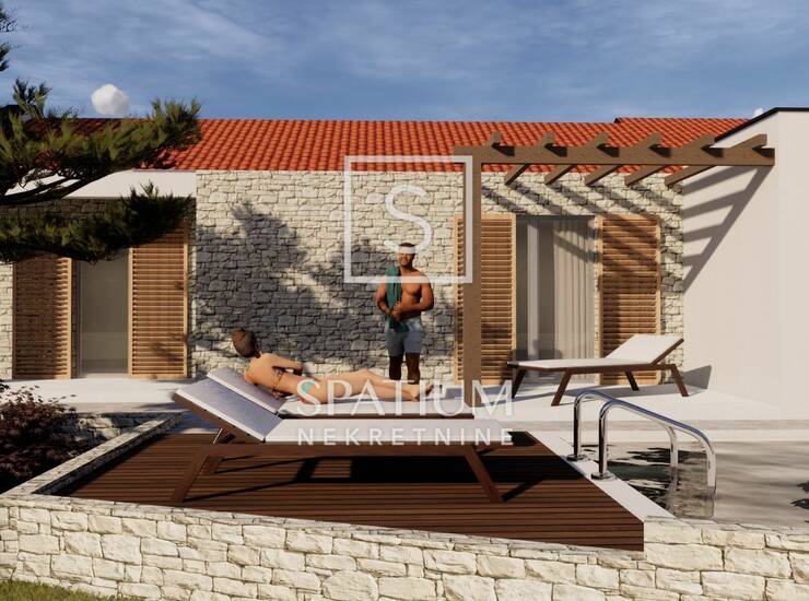 Sastoji se od dvije prostrane spavaće sobe, dvije kupaonice, zasebnog toaleta, "open space" kuhinje s blagovaonicom i dnevnim boravkom koji je povezan s natkrivenom terasom gdje će vas dočekati prekrasan pogled na okolnu prirodnu ljepotu gdje možete uživajte u večeri na otvorenom s obitelji i prijateljima, organizirati nezaboravna okupljanja ili se jednostavno opustiti na blagom morskom povjetarcu. Uz terasu se nalazi i vlastiti bazen (32m2) za pravo opuštanje. Kameni zidovi dodaju karakter i toplinu, dok moderni detalji osiguravaju besprijekoran spoj stila i luksuza. Ukupna iskoristiva površina interijera iznosi 96m2.