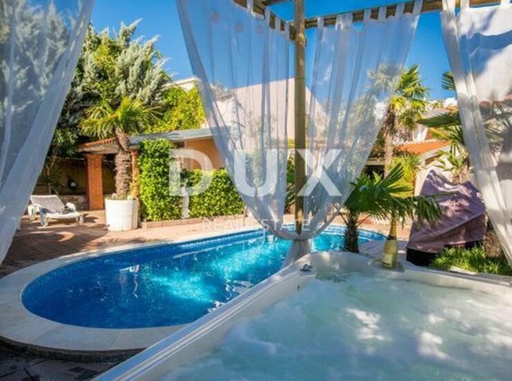 Na okućnici se osim tri parkirna mjesta nalazi grijani bazen, hidromasažna kada i zidani roštilj. Okućnica je ograđena visokom ogradom i pruža savršenu privatnost.