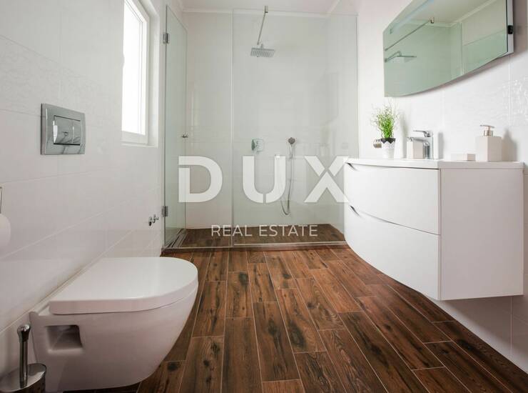 Ova lijepa kuća smjestila se oko 1600 m od mora na mirnoj lokaciji. Ima oko 250 m2 koji su se raspodijelili na tri etaže. U suterenu se nalazi prostorija za druženje i igru, a ovisno o želji može dobiti i neku drugu namjenu. U prizemlju se nalazi kupaonica, spavaća soba sa svojom kupaonicom, kuhinja s blagovaonicom i dnevni boravak iz kojih se izlazi na lijepo uređenu okućnicu s mediteranskim biljem na kojoj se nalazi bazen od 30 m2 sa sunčalištem, natkrivena terasa s roštiljem i spremište s vešerajem. Treba naglasiti da se s terase sunčališta vidi more. Na katu su se smjestile dvije velike spavaće sobe sa svojim kupaonicama iz kojih se izlazi na veliki balkon s panoramskim pogledom na more. Kuća ima solarne panele za grijanje vode.