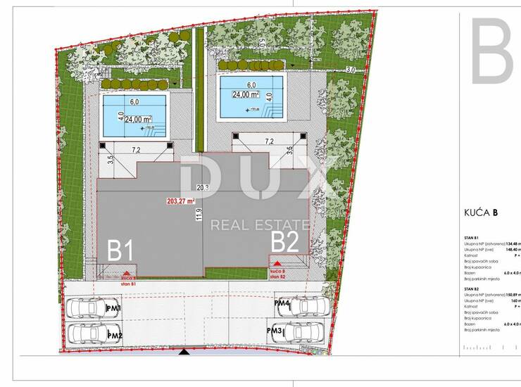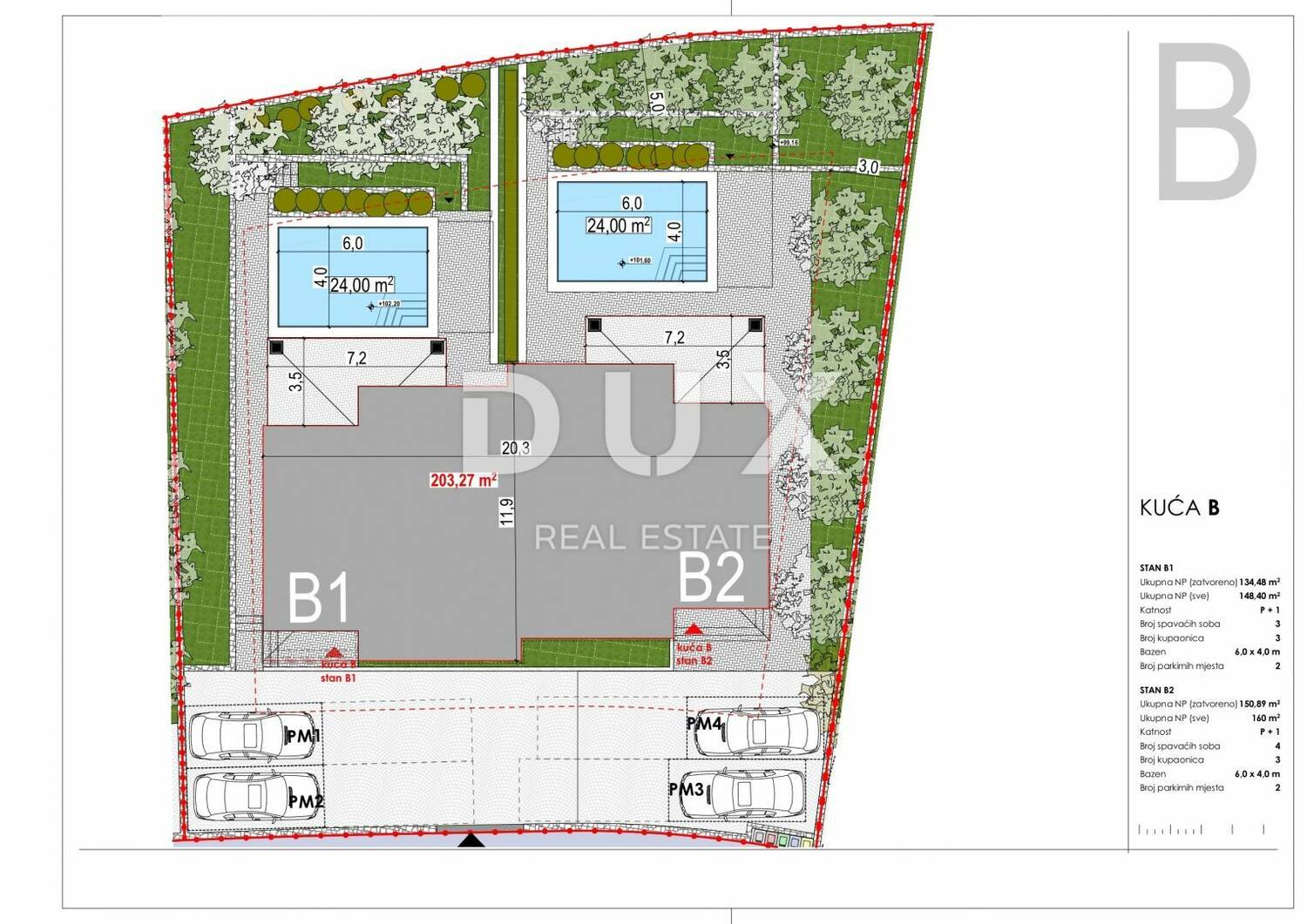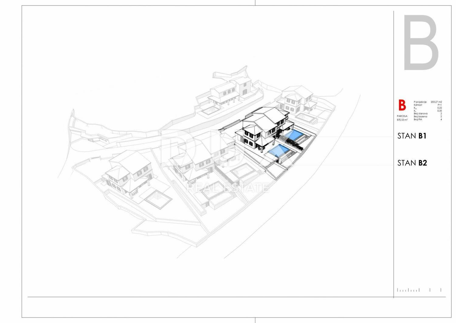 Prodaje se projekt dvojne kuće ”B” svaka sa svojim vlastitim bazenom, okućnicom i parkiralištem za dva automobila po svakoj, koja je razvedena na prizemlje i kat.