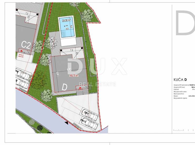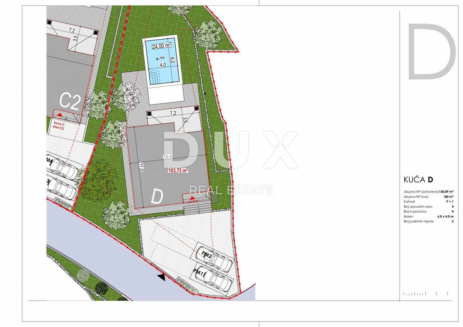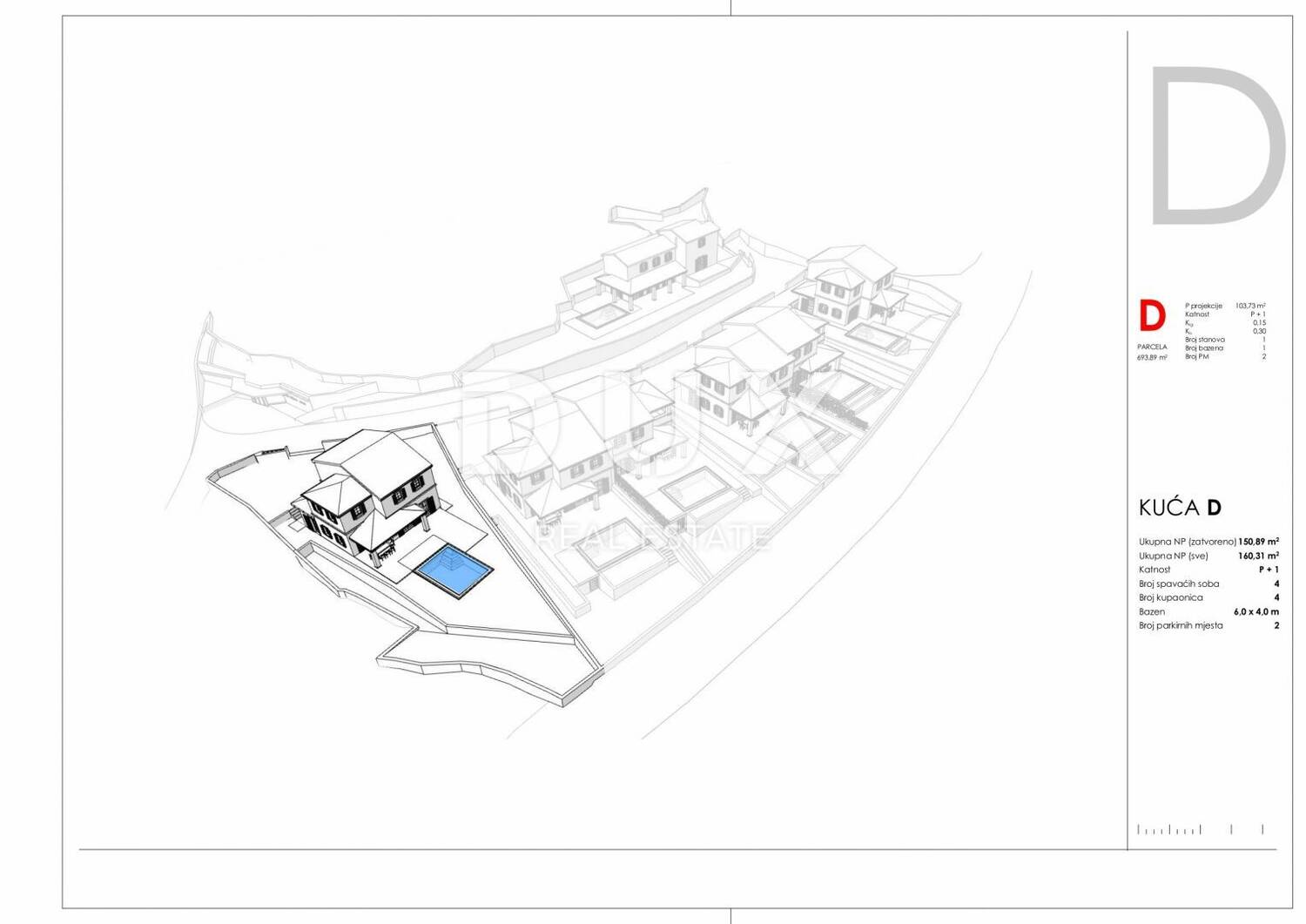 Prodaje se projekt samostojeće kuće ”D” s bazenom i okućnicom koja je razvedena na prizemlje i kat.