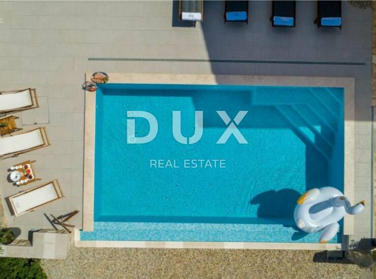 Villa u kojoj se stan nalazi je orijentirana prema moru s prekrasnim pogledom, a na vrhunski uređenoj okućnici ističe se bazen, sunčalište s ležaljkama i vanjska kuhinja s kaminom sa pripadajućom garniturom za ugodno druženje s prijateljima.