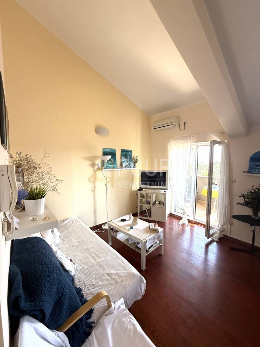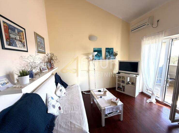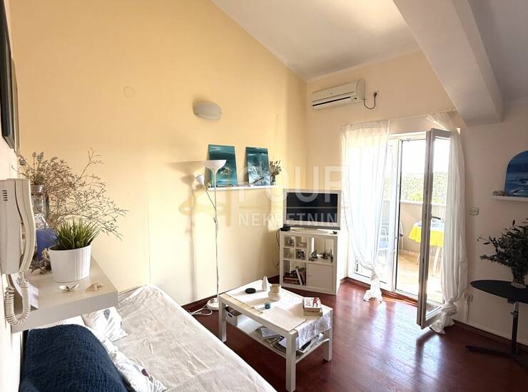 Stan površine 44,65 m2 sastoji se od dnevnog boravka povezanog s kuhinjom i blagovaonicom, prostrane spavaće sobe, kupaonice, hodnika te lođe veličine 3,7 m2 s koje se pruža lijep pogled na more i prirodu. U izvornom je stanju, uredan i očuvan, opremljen klimom i PVC stolarijom te se prodaje namješten, što ga čini spremnim za korištenje ili turistički najam bez dodatnih ulaganja. Posebna prednost je i veliko vanjsko parkirno mjesto u okućnici koje se koristi uz stan.