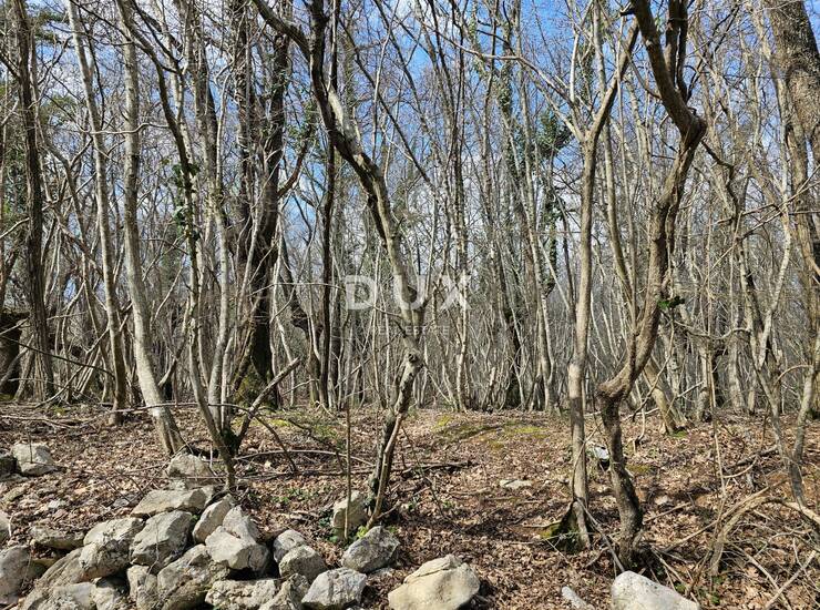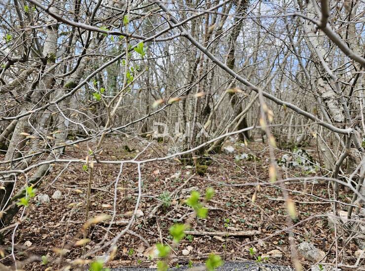 Šuma je gusto prekrivena drvećem - grab i hrast, a zemljište je omeđeno suhozidom.