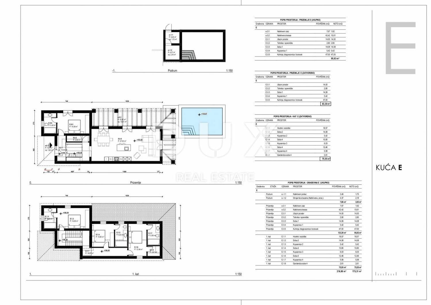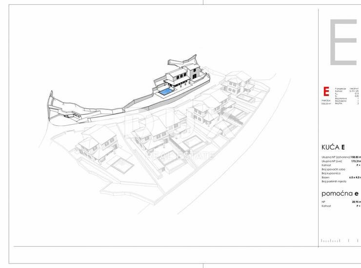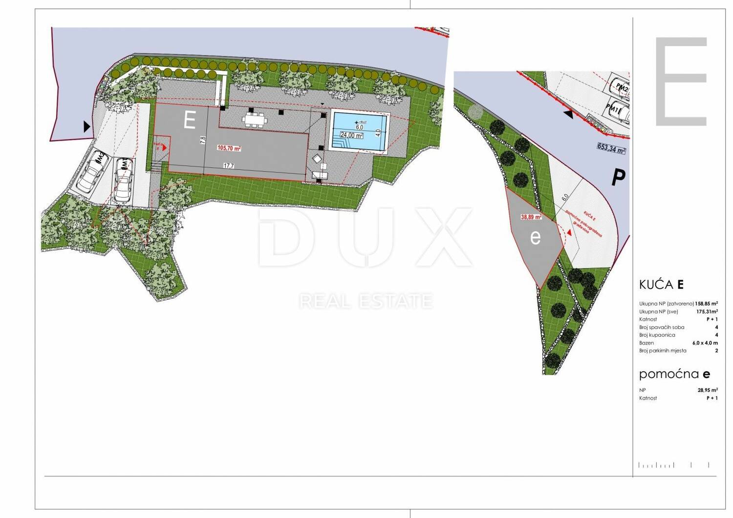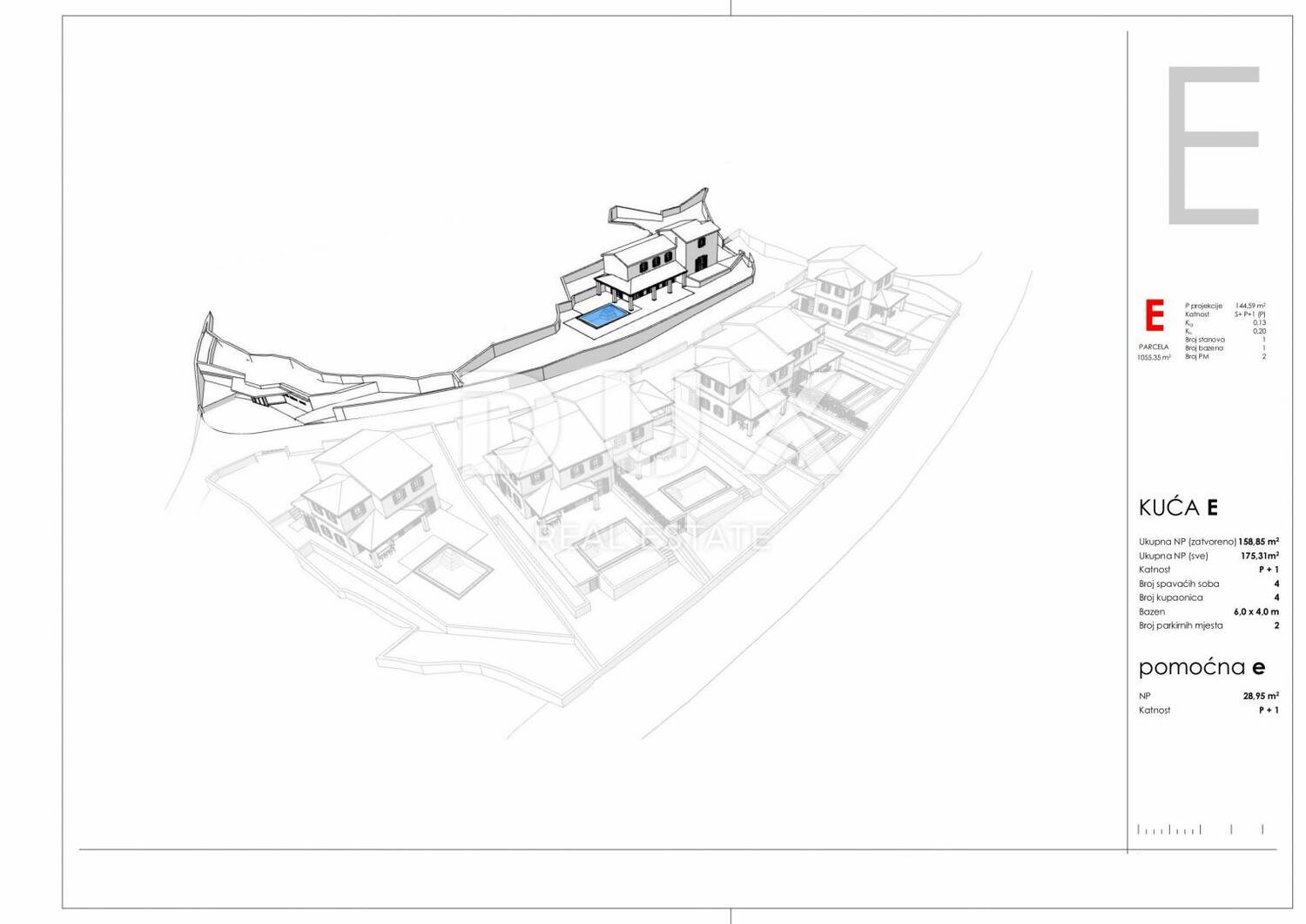 Prodaje se građevinsko zemljište površine 863,99m2. Projekt za izgradnju samostojeće kuće ”E” s bazenom dvorištem i pomoćnim objektom koja je razvedena na prizemlje i kat.