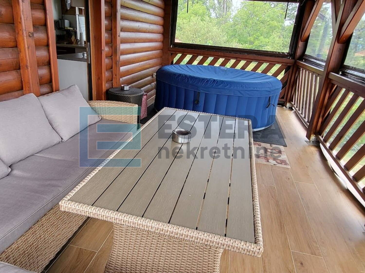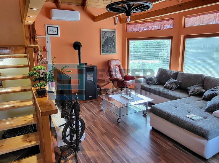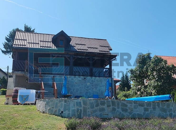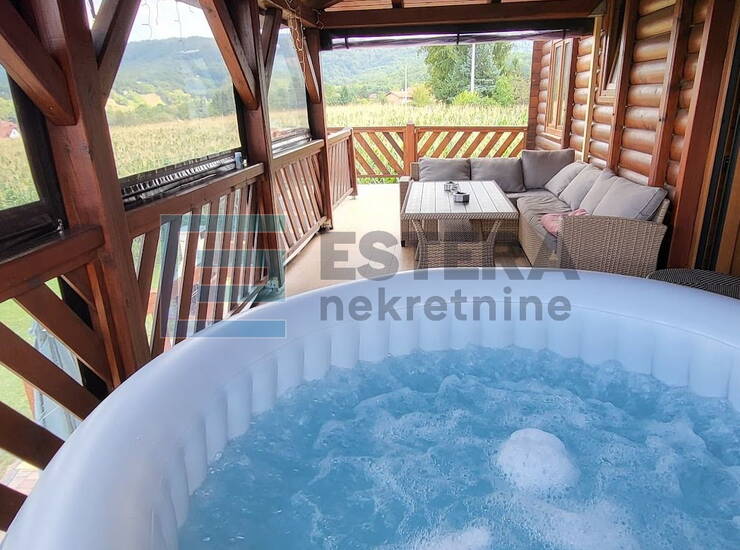 Na prodaju je drvena montažna kuća s bazenom i plantažom sibirskih borovnica. Kuća je izgrađena 2008./2009. godine na armirano-betonskim temeljima i ima tlocrt površine 110 m².