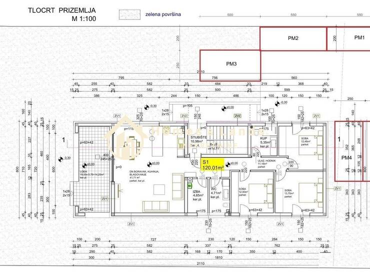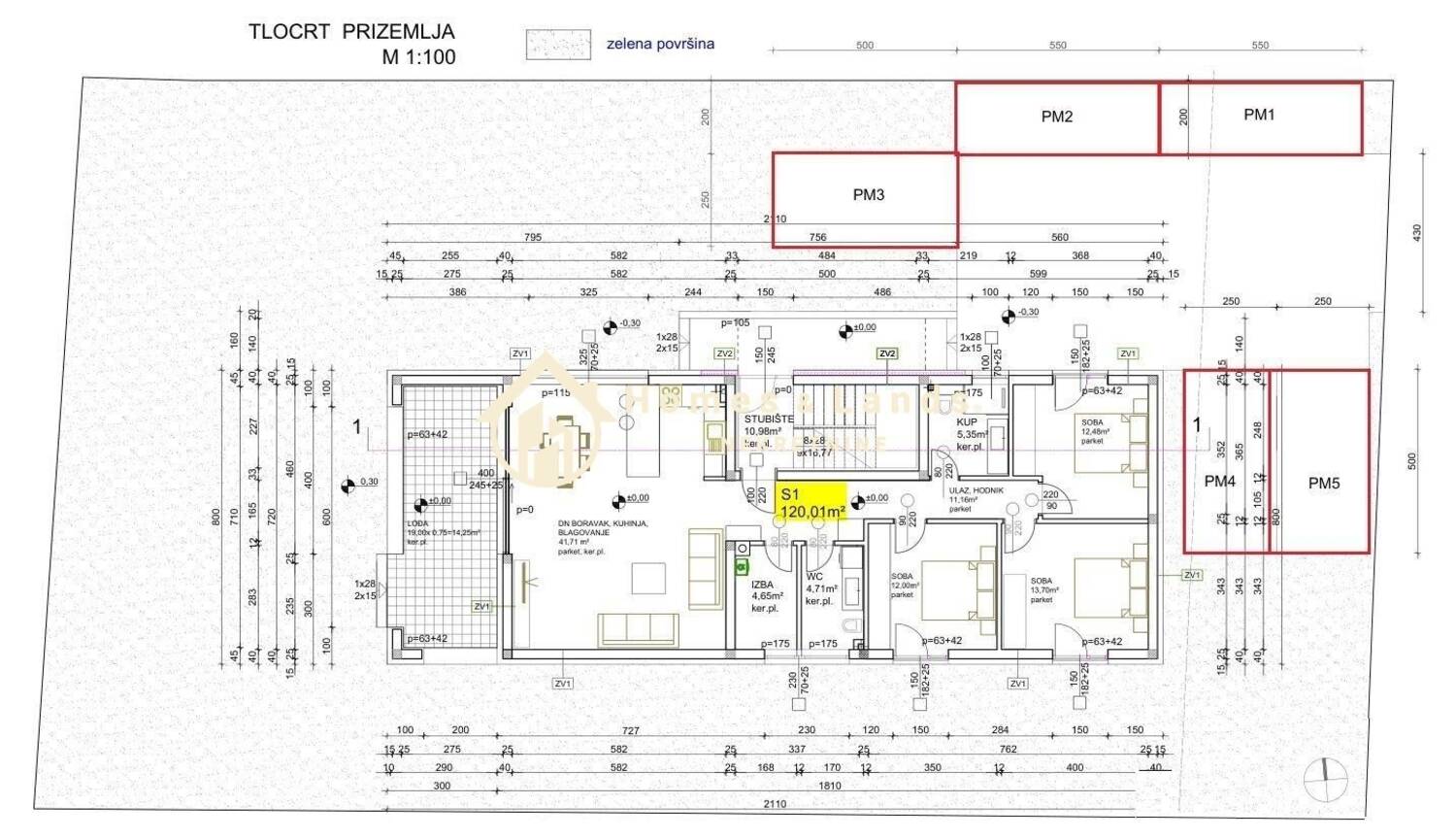 4- sobni stan S1 u prizemlju zgrade ,obračunske površine 166m2 , stan je korisne površine 120m2 i vrta cca 300m2(30m2obračunski) s tri strane se sastoji od ulaznog hodnika,prostranog open space prostora u kojem se nalazi kuhinja,blagovaonica i dnevni boravak s izlazom za loggiu i velikog vrta,3 spavaće sobe,kupaonice,wc-a i isbe i dva parkinga.(10m2obračunski)