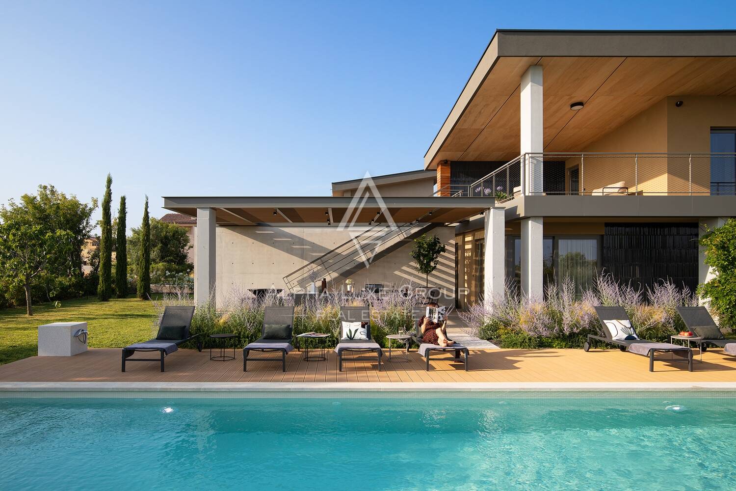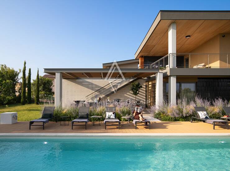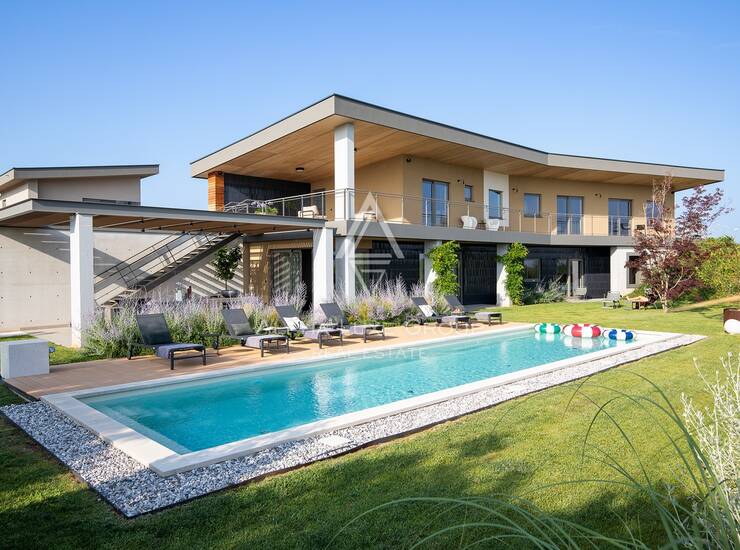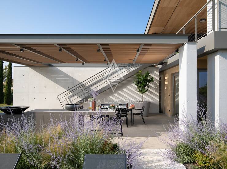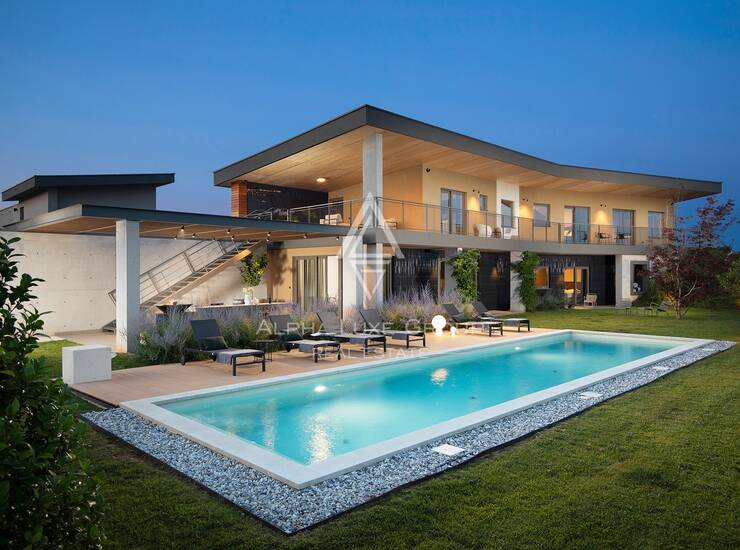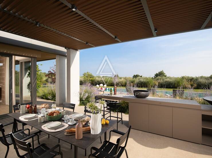 Na prostranoj parceli od 1.363 m² smještena je ova suvremena vila koja nudi 246 m² unutarnjeg stambenog prostora raspoređenog na dvije etaže, uz dodatnih 162 m² terasa. Lokacija je vrlo praktična jer se u blizini nalaze trgovine, restorani i ostali potrebni sadržaji, dok su plaže udaljene svega desetak minuta vožnje.