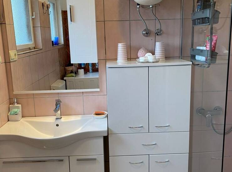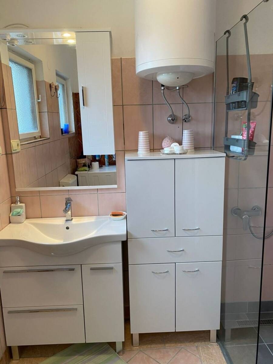 Na početku spomenutog hodnika se nalazi odvojena kuhinja te glavni prostor s blagovaonom i dnevnim boravkom iz kojega se proteže pristup prema terasi koja ima pogled na predivnu okućnicu . Tu se nalazi dodatna ljetna kuhinja.