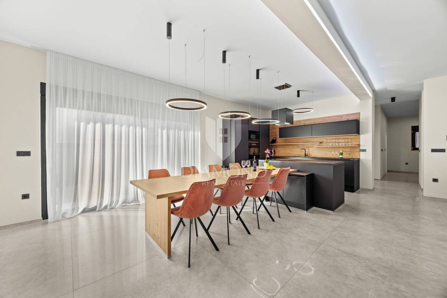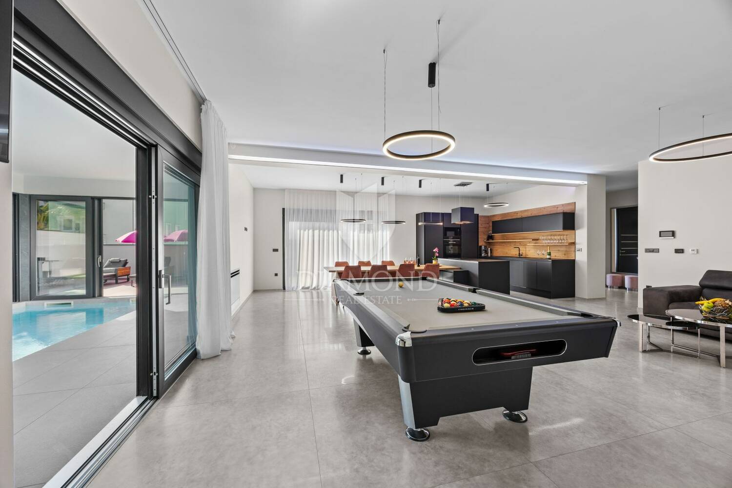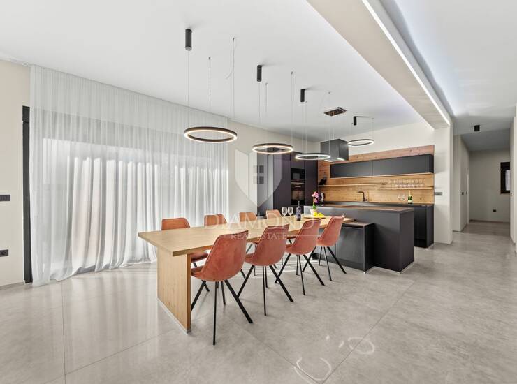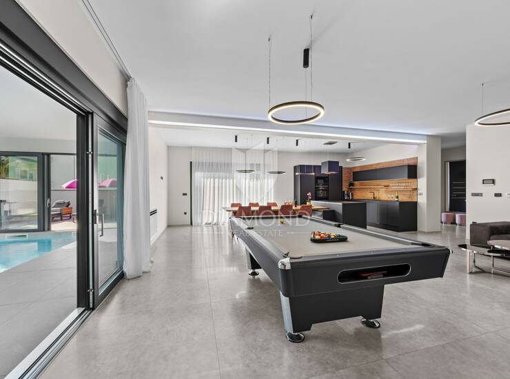 U prizemlju se nalazi prostrani dnevni boravak, iz kojeg se pruža prekrasan pogled na unutarnji grijani bazen sa slatkom vodom. Tu su još kuhinja i blagovaonica s izlazom na prostranu terasu i uređeno dvorište, kupaonica, ostava te zatvoreni wellness prostor u kojem se nalaze grijani bazen i sauna, idealni za opuštanje tijekom cijele godine.Unutarnjim stepenicama dolazi se na prvi kat, gdje se nalaze četiri prostrane spavaće sobe, svaka s vlastitom kupaonicom. Dvije spavaće sobe imaju izlaz na veliku natkrivenu terasu, savršenu za uživanje u mirnom okruženju i mediteranskoj atmosferi.