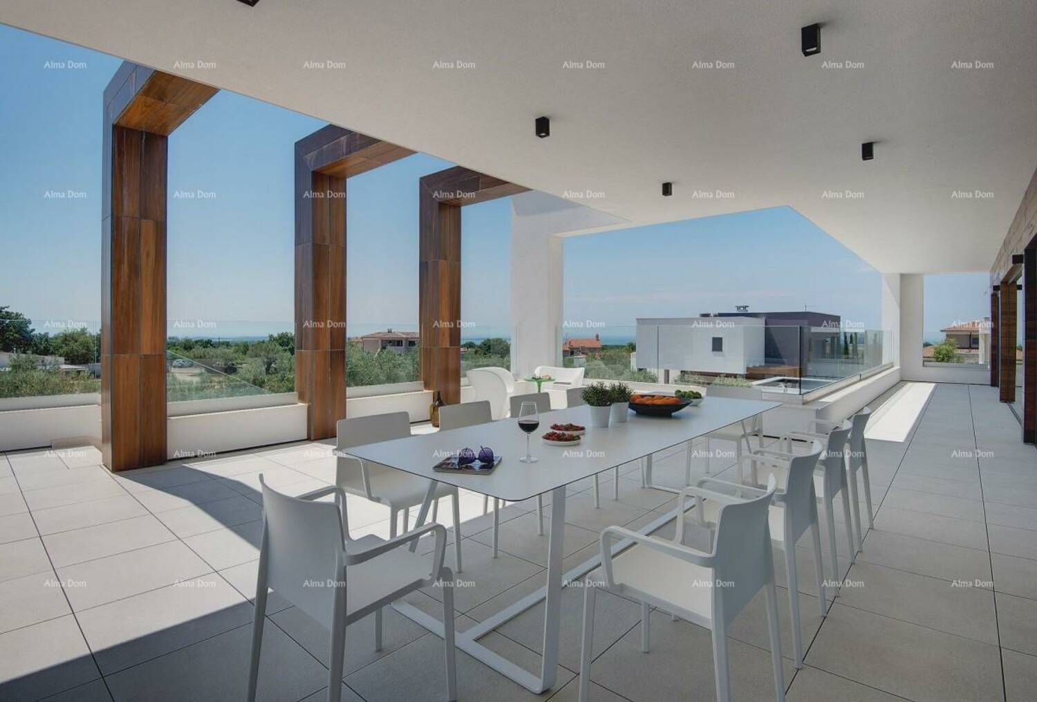 Na katu kuće se nalaze 2 spavaće sobe, prostrani dnevni boravak s blagavaonicom i kuhinjom te velika natkrivena terasa s pogledom na more.