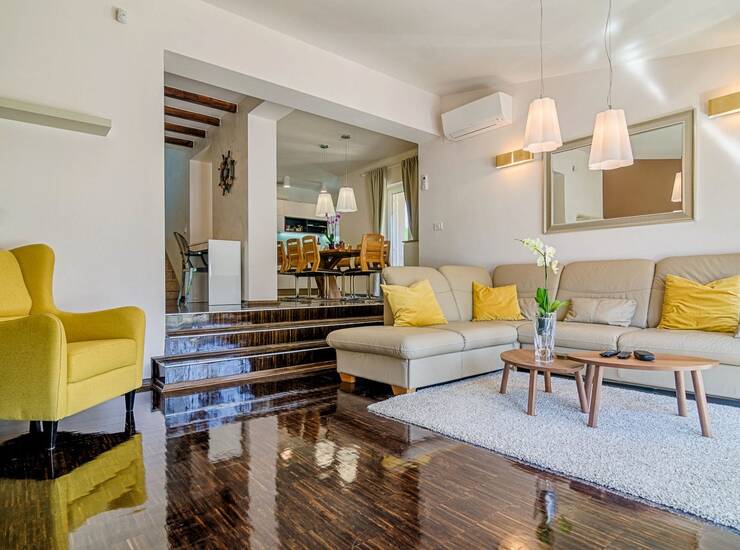 Nedaleko od fažanske šetnice i prvih plaža smještena je ova prekrasna obiteljska kuća. Stambene je površine 220m2 a proteže se kroz prizemlje i prvi kat. Prizemlje nekretnine sastoji se od ulaznog hodnika, dnevnog boravka s izlazom na dvorište, kuhinje s blagovaonicom, dvije spavaće sobe s vlastitim kupaonicama, gostinjskog wc-a te unutarnjeg stubišta kojim dolazimo na prvi kat. Gornja etaža sastoji se od predsoblja, dvije spavaće sobe s vlastitim kupaonicama te izlaza na natkrivenu terasu.