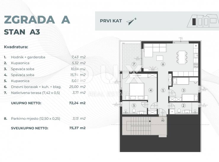 Radi se o stanu koji ukupno nudi 75,37 s parkirnim mjestom u kvadraturi!