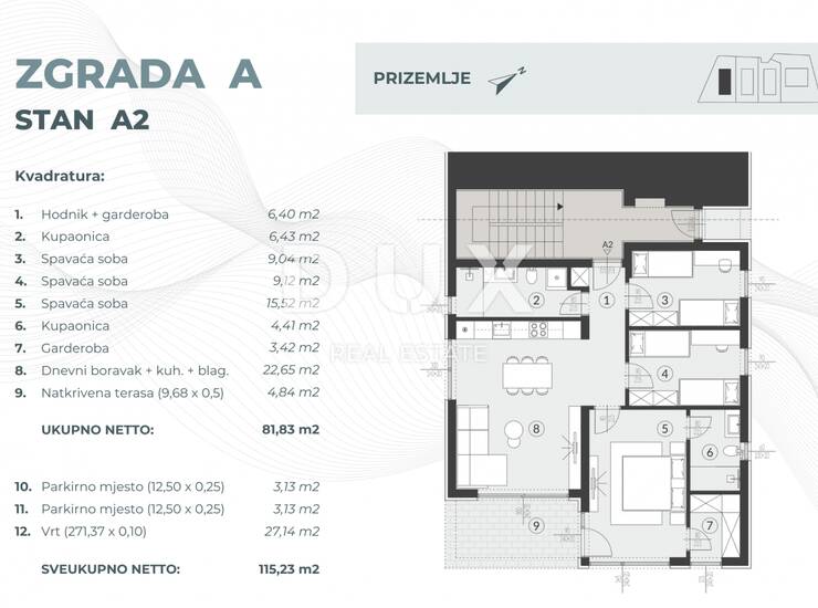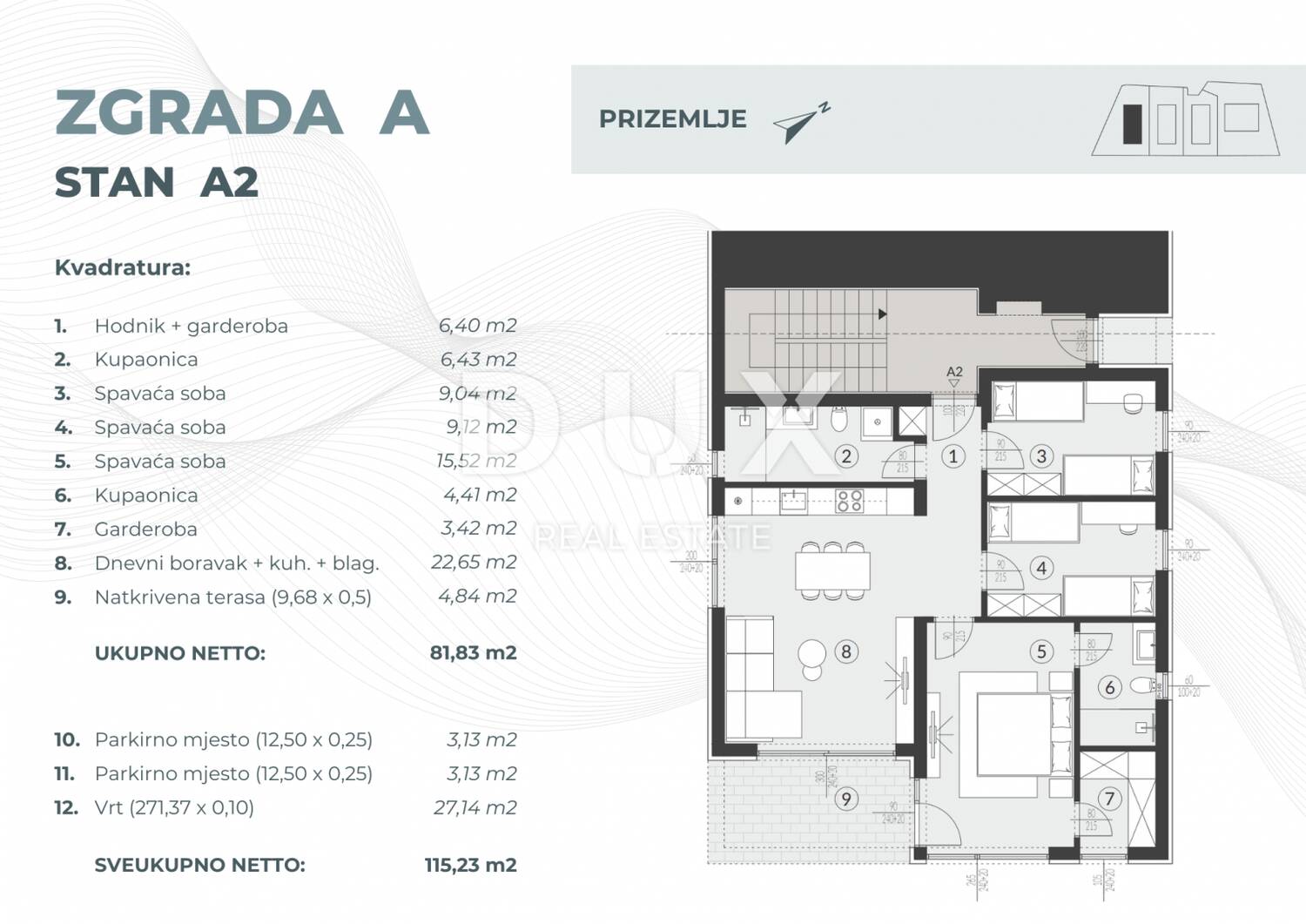 Radi se o stanu koji ukupno nudi 115,23 m2 s pripadajućim vrtom i dva parkirna mjesta u kvadraturi!