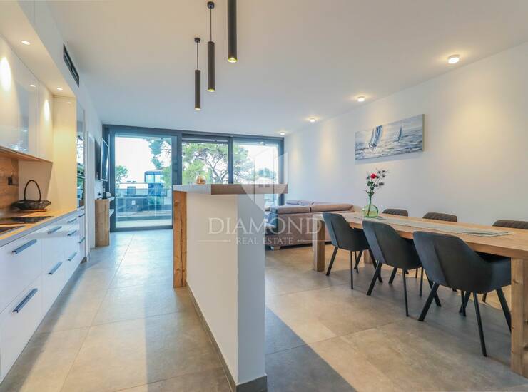 Na prodaju je luksuzan stan, udaljen svega 80 metara od plaže, s očaravajućim pogledom na more. Stan je smješten u dvokatnoj stambenoj zgradi vrhunske kvalitete i dizajna, okruženoj ograđenom okućnicom s popločenim parkirnim mjestima. Svakom stanu pripada vlastito parkirno mjesto i spremište površine oko 6 m².