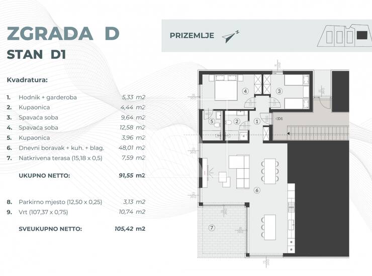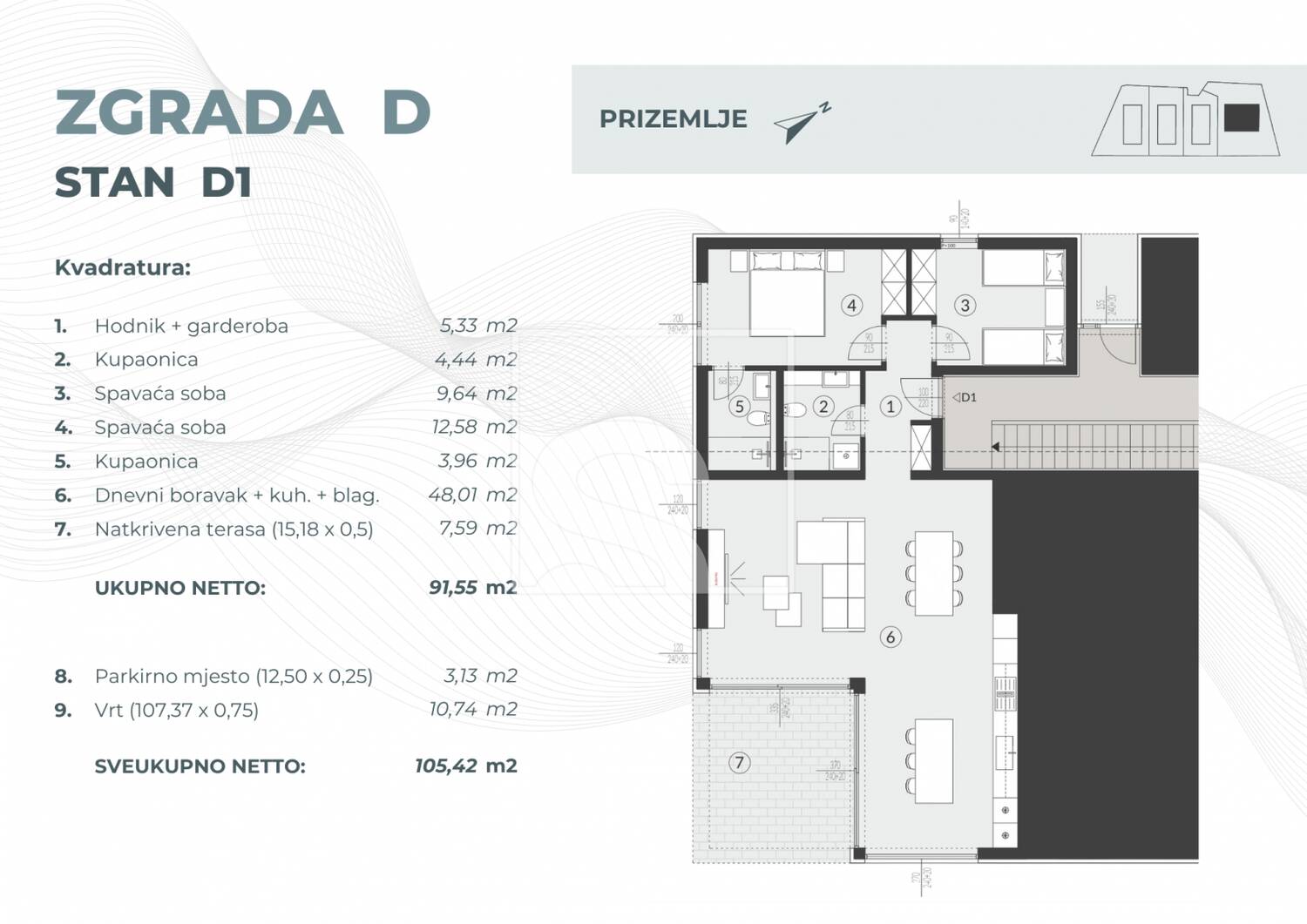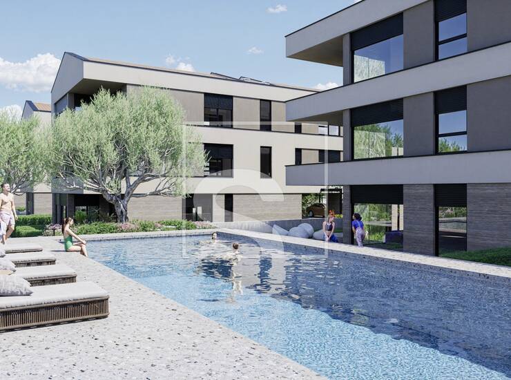 Stan s dvorištem i velikim zajedničkim bazenom - novogradnja