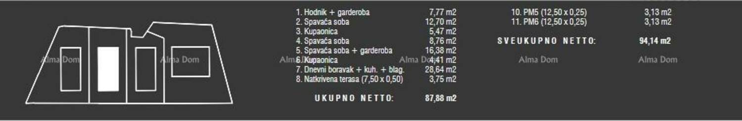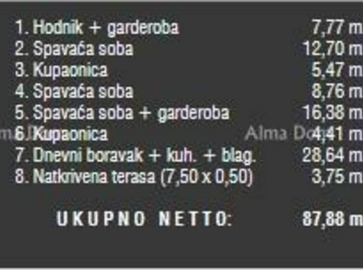 Stan se sastoji od hodnika+garderobe, dnevnog boravka s kuhinjom i blagovaonom, 2 spavaće sobe (jedna s garderobom), 2 kupaone i natkrivene terase.