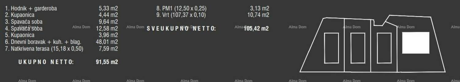Stan se sastoji od ulaznog hodnika, garderobe, dnevnog boravka s kuhinjom i blagovaonom, 2 spavaće sobe, 2 kupaone, terase i vrta od 107,37 m2 (10.74m2).