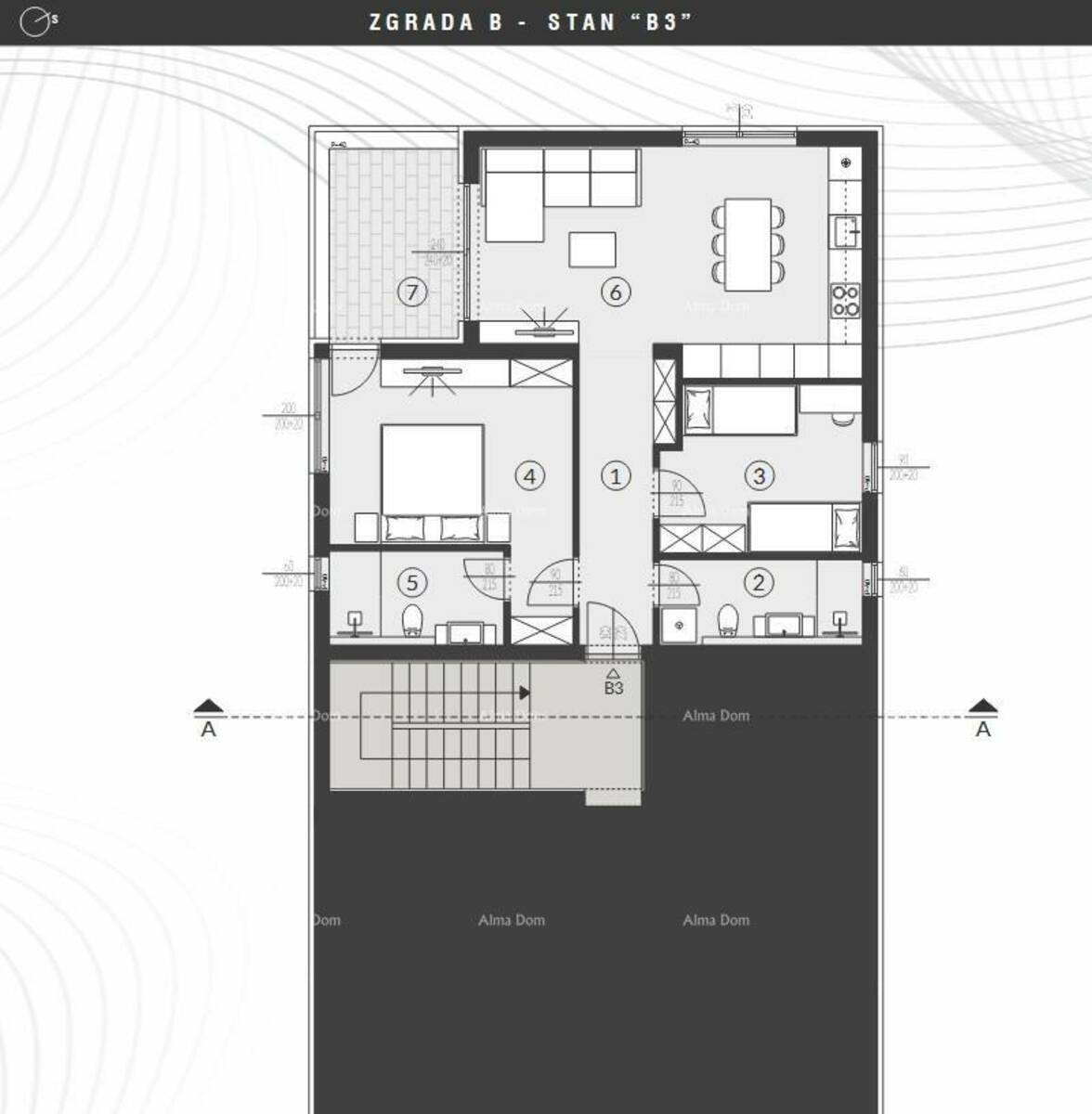 Stan B3 nalazi se na prvom katu zgrade s 3 etaže.