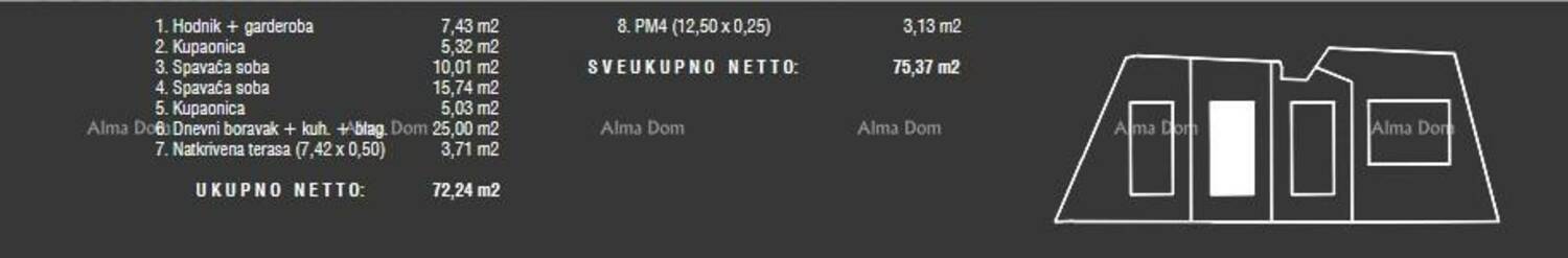 Stan se sastoji od hodnika+garderobe, dnevnog boravka s kuhinjom i blagovaonom, 2 spavaće sobe, 2 kupaone, garderobe i natkrivene terase.