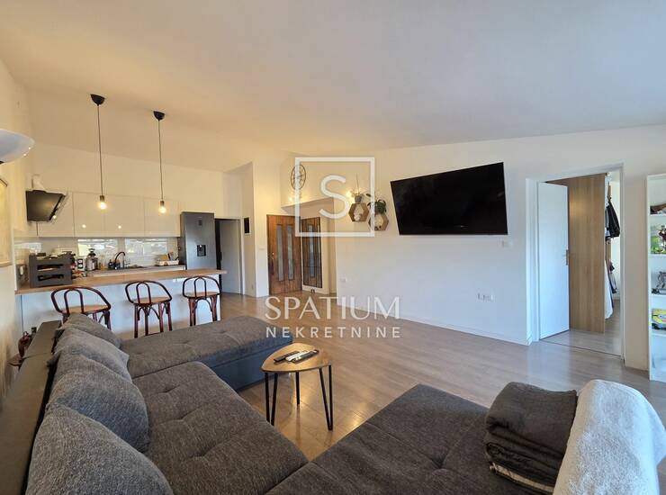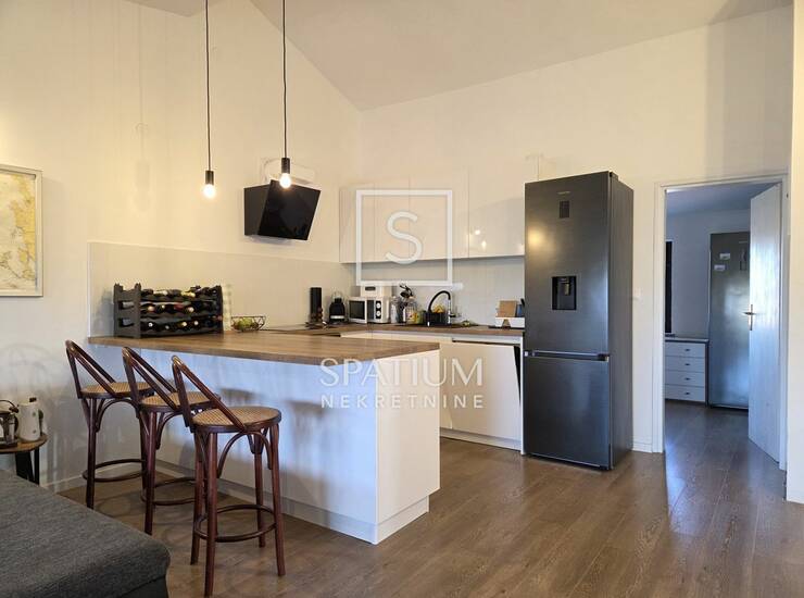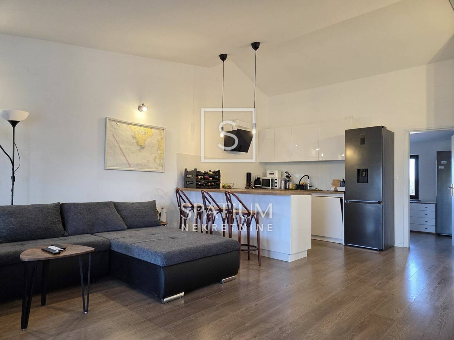 VALBANDON, u ponudi je potpuno renoviran i funkcionalan stan površine 90,56 m² smješten na drugom katu manje stambene zgrade. Stan se sastoji od prostranog otvorenog prostora dnevnog boravka s modernom kuhinjom, tri spavaće sobe, kupaonice s podnim grijanjem te dvije terase, od kojih je jedna velika i polunatkrivena. Visoki stropovi i jugoistočna orijentacija osiguravaju obilje prirodne svjetlosti i osjećaj prozračnosti tijekom cijelog dana. Stan je kompletno renoviran 2022. godine, uključujući nove instalacije struje i vode, podove, klima uređaj te novu kuhinju s aparatima, a prodaje se potpuno opremljena. Parkirna mjesta dostupna su ispred zgrade, a najbliža plaža se nalazi na svega 500 metara udaljenosti.