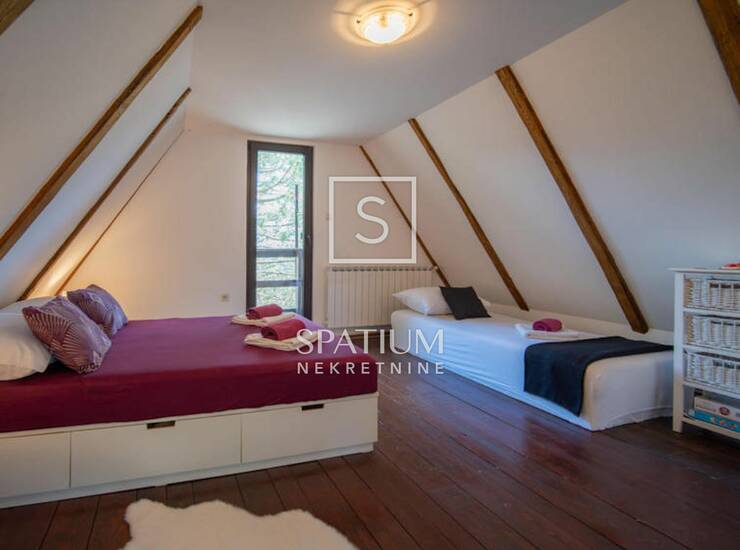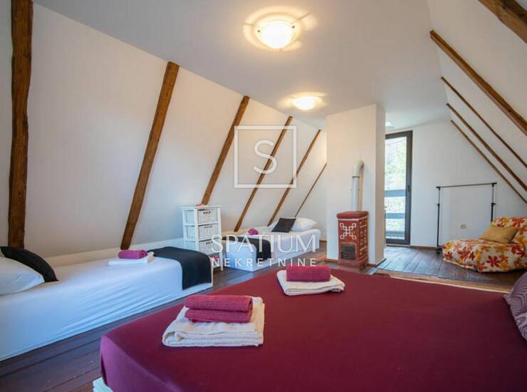 Potkrovlje: prostrani spavaći prostor za šest osoba, s izlazom na dvije terase. Kuća je dodatno opremljena podnim grijanjem, centralnim grijanjem na pelete, ima montažni bazen, saunu i jacuzzi, te vlastito parkiralište.