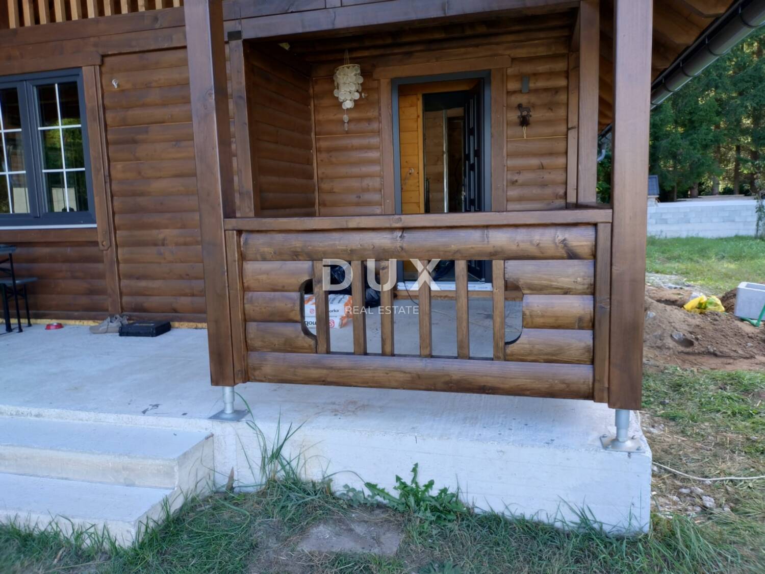 Glavna kuća površine 90 m² izrađena je od punih drvenih trupaca debljine 19 cm, što joj daje ne samo autentičan rustikalni izgled, već i iznimnu termo-izolaciju te ugodnu atmosferu tijekom cijele godine. Krov je pokriven sindrom, s termo izolacijom debljine 15 cm i nagibom od 39 stupnjeva, dok je pod dodatno izoliran – ispod drvenog poda nalazi se armirano-betonska ploča, zračni prostor od 15 cm te izolacija iste debljine, što osigurava udobnost i toplinu bez obzira na godišnje doba. U tijeku je postavljanje podog grijanja kao i keramike.